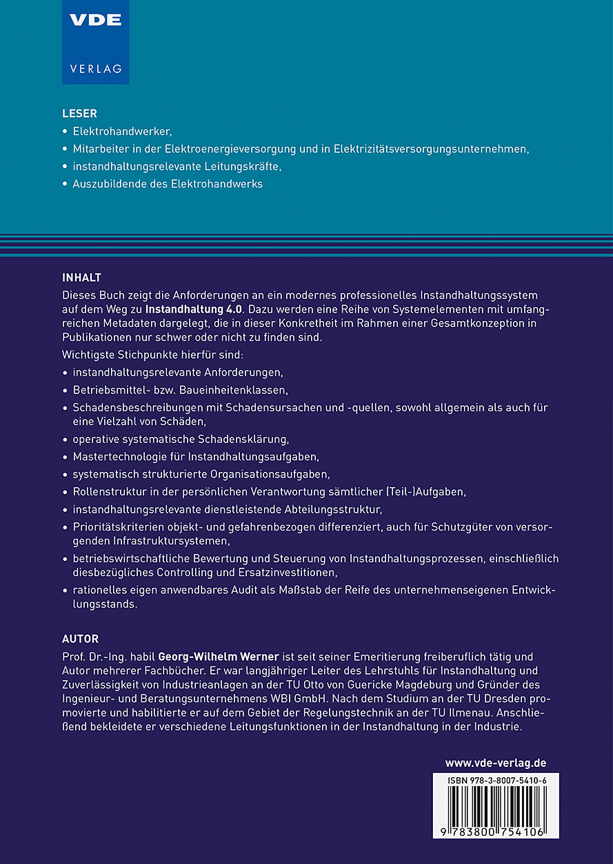 Prof. Dr.-Ing. habil Georg-Wilhelm Werner ist seit seiner Emeritierung freiberuflich tätig und Autor mehrerer Fachbücher. Er war langjähriger Leiter des Lehrstuhls für Instandhaltung und Zuverlässigkeit von Industrieanlagen an der TU Otto von Guericke Magdeburg und Gründer des Ingenieur- und Beratungsunternehmens WBI GmbH.