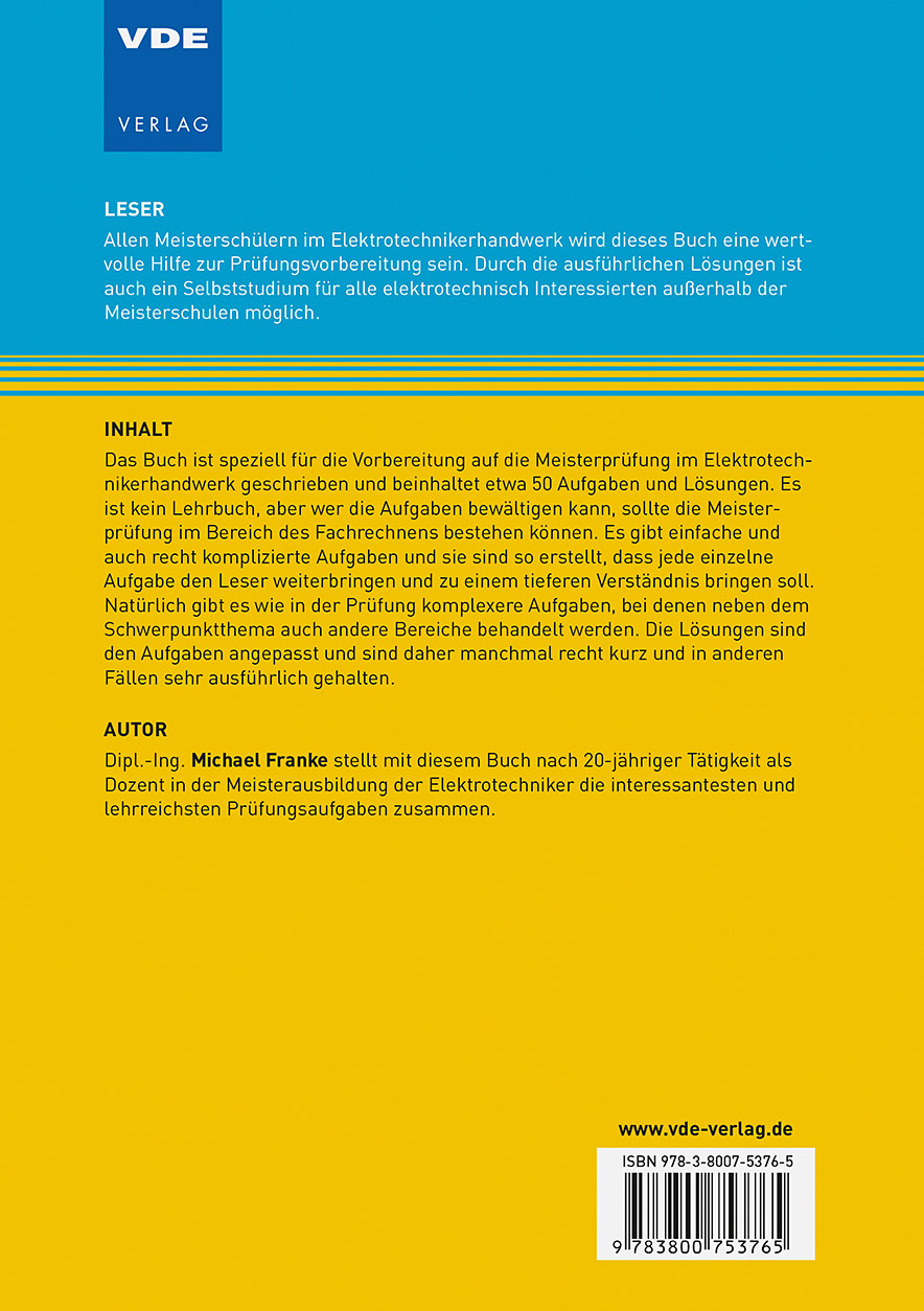 Dipl.-Ing. Michael Franke stellt mit diesem Buch nach 20-jähriger Tätigkeit als Dozent in der Meisterausbildung der Elektrotechniker die interessantesten und lehrreichsten Prüfungsaufgaben zusammen.