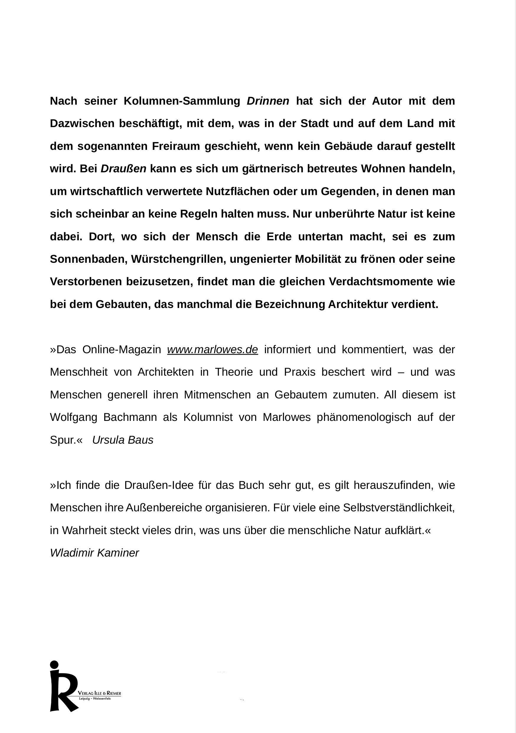 »Ich finde die Draußen-Idee für das Buch sehr gut, es gilt herauszufinden, wie Menschen ihre Außenbereiche organisieren. Für viele eine Selbstverständlichkeit, in Wahrheit steckt vieles drin, was uns über die menschliche Natur aufklärt.« Wladimir Kaminer