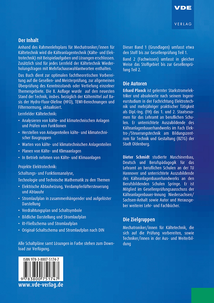 Erhard Planck unterrichtete Auszubildende des Kälteanlagenbauerhandwerks im Fach Elektro-/ Steuerungstechnik am Bildungszentrum für Technik und Gestaltung (BZTG) der Stadt Oldenburg. Dieter Schmidt unterrichtete Auszubildende des Kälteanlagenbauerhandwerks an den Berufsbildenden Schulen Springe. Er ist Mitglied im Gesellenprüfungsausschuss der Kälteanlagenbauer-Innung Niedersachsen/Sachsen-Anhalt sowie Autor und Herausgeber weiterer Lehr- und Fachbücher.