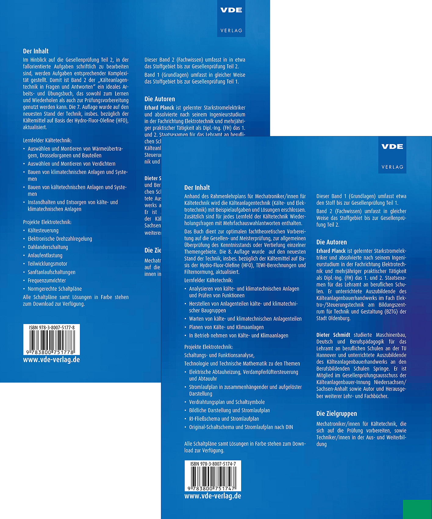 Erhard Planck unterrichtete Auszubildende des Kälteanlagenbauerhandwerks im Fach Elektro-/ Steuerungstechnik am Bildungszentrum für Technik und Gestaltung (BZTG) der Stadt Oldenburg. Dieter Schmidt unterrichtet Auszubildende des Kälteanlagenbauerhandwerks an den Berufsbildenden Schulen Springe, er ist Mitglied im Gesellenprüfungsausschuss der Kälteanlagenbauer-Innung Niedersachsen/Sachsen-Anhalt sowie Autor und Herausgeber weiterer Lehr- und Fachbücher.