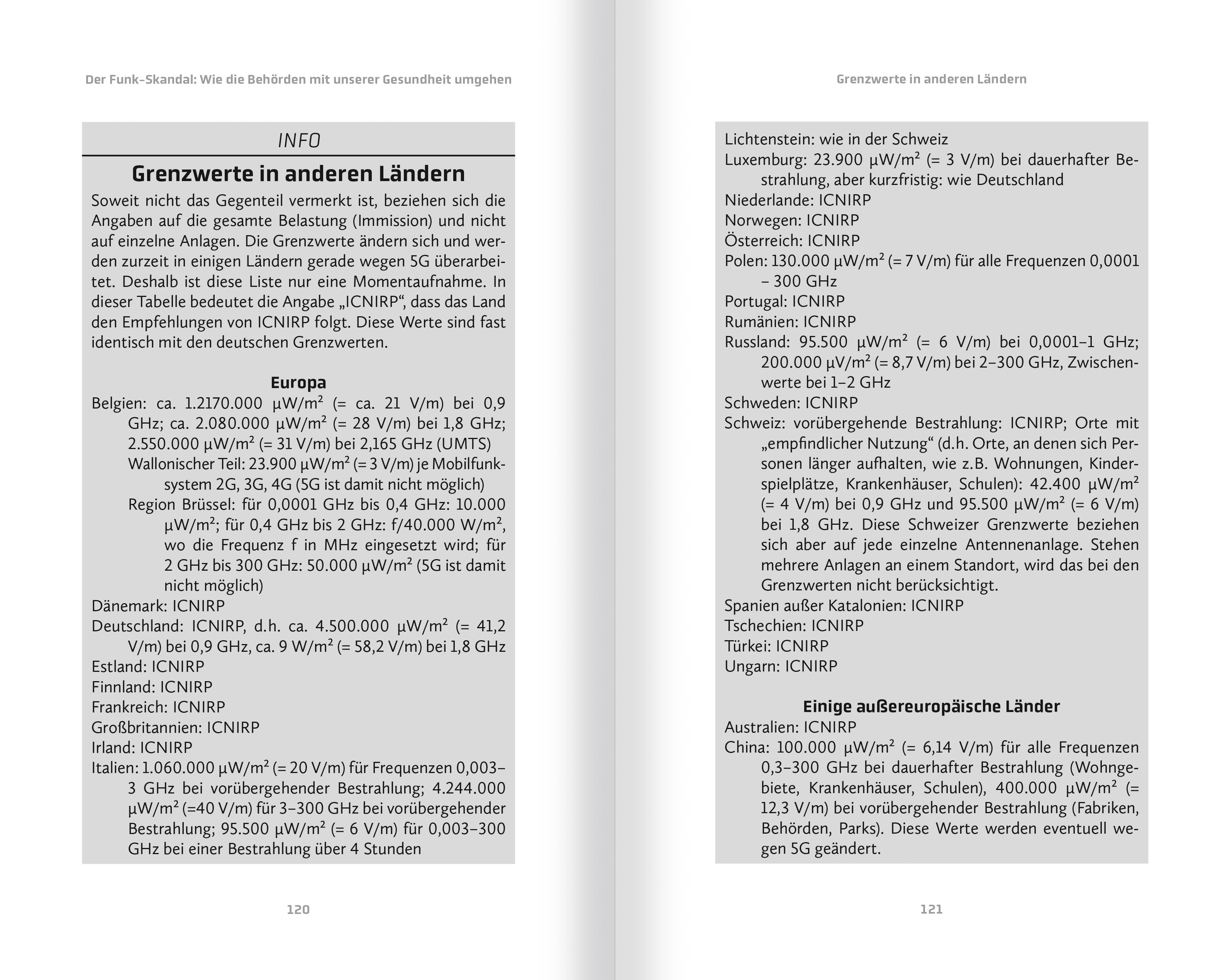 INHALTVorwortGRUNDLAGENFunkstrahlungPulsungINFO: Die wichtigsten Fachbegriffe und EinheitenINFO: Quellen von FunkstrahlungWas ist neu bei 5G?INFO: Wie breitet sich die Strahlung einer Antenne aus?WIRKUNG AUF DEN MENSCHENErste ReaktionenWirkmechanismen der FunkstrahlungINFO: Öffnung der Calcium-Kanäle durch Änderung der ProteinfaltungFunkstrahlung und ihre Wirkung auf den menschlichen Körper- Muskelzellen- Nerven- Mitochondrien- Entstehung aggressiver chemischer Verbindungen- Energiemangel- Immunsystem- Viren- Entzündungen- Blut-Hirn-SchrankeKRANKHEITSRISIKEN DURCH FUNKSTRAHLUNGKombinierte Wirkung mehrerer Einflüsse?Herzfrequenz (Puls)Gehirn, gepulste StrahlungSchlafstörungenFruchtbarkeitGenschädenKrebsVorzeitige DemenzSchädigungen bei Kindern und JugendlichenWann ist Funkstrahlung als Ursache einer Krankheit bewiesen?Elektrohypersensibilität (EHS)- Weiße Zonen als mögliche Lösungen?- Medizinische Behandlungsziele- Beweisführung der EHS- Hilfreiche Maßnahmen bei starker Funkbelastung- Alternative LösungsmöglichkeitenWas ist bei 5G anders?INFO: Erkrankungen durch FunkbelastungSCHÄDEN AN DER LEBENDIGEN NATURBakterienPflanzenInsekten, insbesondere Ameisen und BienenRinder und SchweineDER FUNK-SKANDAL: WIE DIE BEHÖRDEN MIT UNSERER GESUNDHEIT UMGEHENDie AnfängeWirtschaftsinteressen vor GesundheitsschutzINFO: Grenzwerte in Deutschland INFO: Grenzwerte in anderen LändernDer Grenzwertvorschlag 2020 von ICNIRPINFO: Der ICNIRP-Grenzwertvorschlag von 2020 in ZahlenEchte und "nützliche" WissenschaftDas liebe GeldUnverletzlichkeit der Wohnung VorsorgeprinzipVerletzung von GrundrechtenHaftpflichtrisiko5G UND DIE UMWELTStrom- und RohstoffverbrauchSatellitenDATENSCHUTZ UND DEMOKRATIEÜberwachungBeispiele für die Verwendung der DatenLegale Datensammlung durch Privatfirmen BeeinflussungALTERNATIVEN ZUM JETZIGEN MOBILFUNKNETZRegeln ändern Standorte optimierenLichttechnik SO KÖNNEN WIR UNS WIRKSAM SCHÜTZENWie kann sich eine Gemeinde gegen Funkmasten wehren?Unsere Forderungen an die PolitikPRAXIS: Wie kann man sich schützen?PRAXIS: Schutz durch bauliche MaßnahmenSchlussANHANGEmpfohlene LiteraturEndnotenStichwortregister