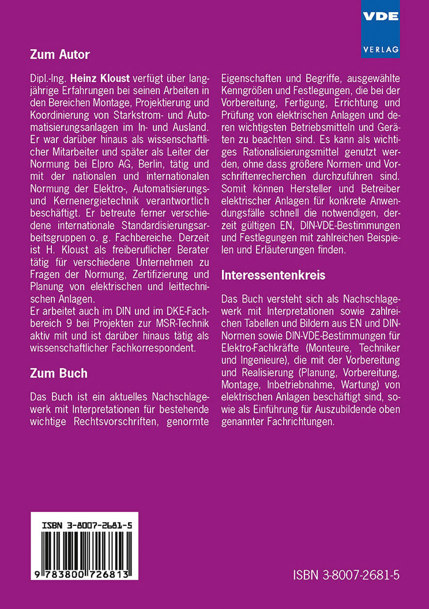 Das Buch ist ein aktuelles Nachschlagewerk mit Interpretationen für bestehende wichtige Rechtsvorschriften, genormte Eigenschaften und Begriffe, ausgewählte Kenngrößen und Festlegungen, die bei der Vorbereitung, Fertigung, Errichtung und Prüfung von elektrischen Anlagen und deren wichtigsten Betriebsmitteln und Geräten zu beachten sind. Es kann als wichtiges Rationalisierungsmittel genutzt werden, ohne dass größere Normen- und Vorschriftenrecherchen durchzuführen sind. Somit können Hersteller und Betreiber elektrischer Anlagen für konkrete Anwendungsfälle schnell die notwendigen, derzeit gültigen EN, DIN-VDE-Bestimmungen und Festlegungen mit zahlreichen Beispielen und Erläuterungen finden.