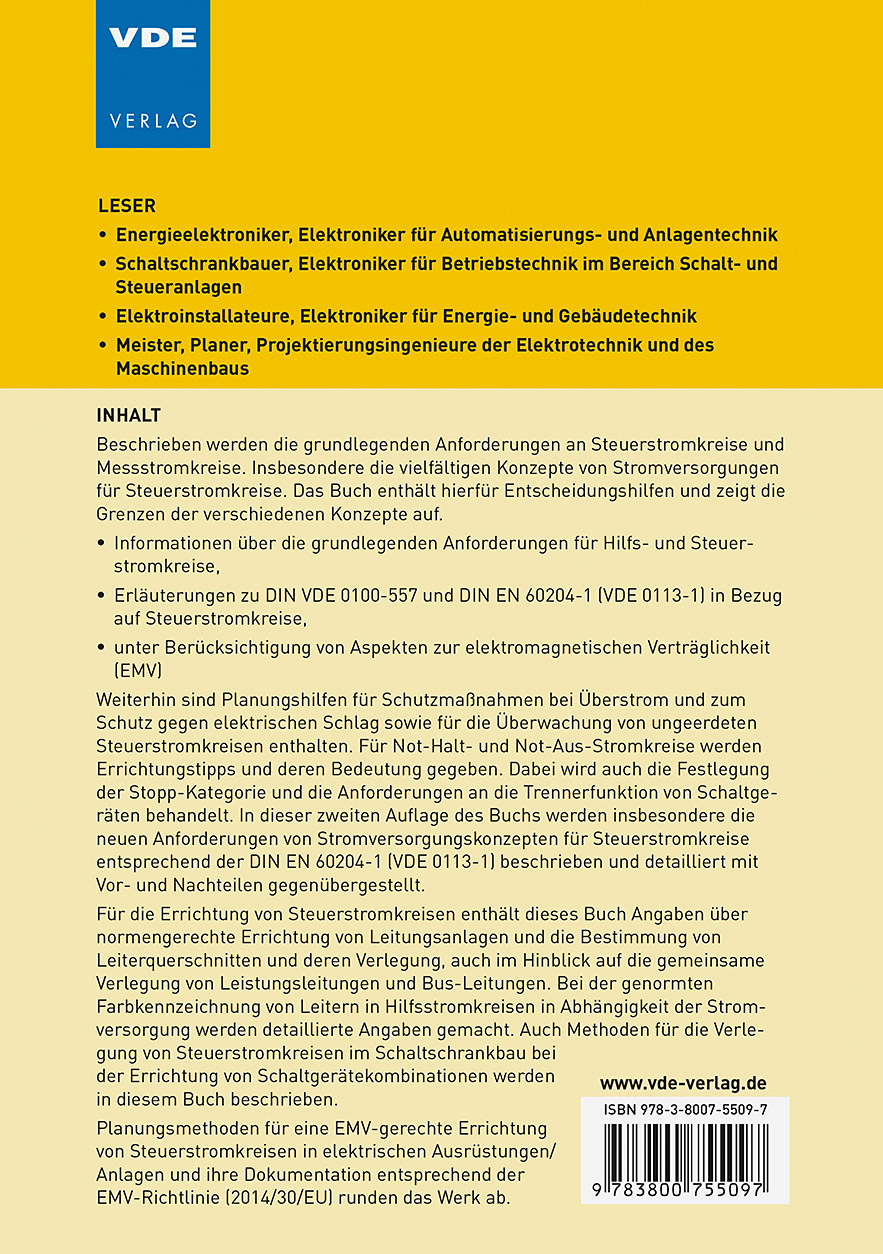 Beschrieben werden die grundlegenden Anforderungen an Steuerstromkreise und Messstromkreise. Insbesondere die vielfältigen Konzepte von Stromversorgungen für Steuerstromkreise. Das Buch enthält hierfür Entscheidungshilfen und zeigt die Grenzen der verschiedenen Konzepte auf.- Informationen über die grundlegenden Anforderungen für Hilfs- und Steuerstromkreise,- Erläuterungen zu DIN VDE 0100-557 und DIN EN 60204-1 (VDE 0113-1) in Bezug auf Steuerstromkreise,- unter Berücksichtigung von Aspekten zur elektromagnetischen Verträglichkeit (EMV)Weiterhin sind Planungshilfen für Schutzmaßnahmen bei Überstrom und zum Schutz gegen elektrischen Schlag sowie für die Überwachung von ungeerdeten Steuerstromkreisen enthalten. Für Not-Halt- und Not-Aus-Stromkreise werden Errichtungstipps und deren Bedeutung gegeben. Dabei wird auch die Festlegung der Stopp-Kategorie und die Anforderungen an die Trennerfunktion von Schaltgeräten behandelt. In dieser zweiten Auflage des Buchs werden insbesondere die neuen Anforderungen von Stromversorgungskonzepten für Steuerstromkreise entsprechend der DIN EN 60204-1 (VDE 0113-1) beschrieben und detailliert mit Vor- und Nachteilen gegenübergestellt.Für die Errichtung von Steuerstromkreisen enthält dieses Buch Angaben über normengerechte Errichtung von Leitungsanlagen und die Bestimmung von Leiterquerschnitten und deren Verlegung, auch im Hinblick auf die gemeinsame Verlegung von Leistungsleitungen und Bus-Leitungen. Bei der genormten Farbkennzeichnung von Leitern in Hilfsstromkreisen in Abhängigkeit der Stromversorgung werden detaillierte Angaben gemacht. Auch Methoden für die Verlegung von Steuerstromkreisen im Schaltschrankbau bei der Errichtung von Schaltgerätekombinationen werden in diesem Buch beschrieben.Planungsmethoden für eine EMV-gerechte Errichtung von Steuerstromkreisen in elektrischen Ausrüstungen/Anlagen und ihre Dokumentation entsprechend der EMV-Richtlinie (2014/30/EU) runden das Werk ab.