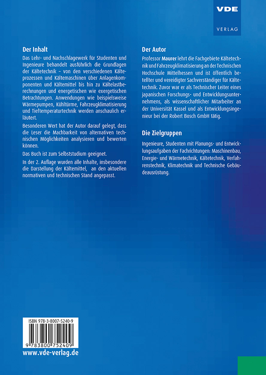| Schlagworte | Feuchte Luft • Kälteerzeugung • Kältelastberechnung • Kältemaschine • Kältemittel • Kältemittelverdichter • Sorptionskältemaschine • Thermodynamik • Verdichterkältemaschine • Wärmeübertrager |