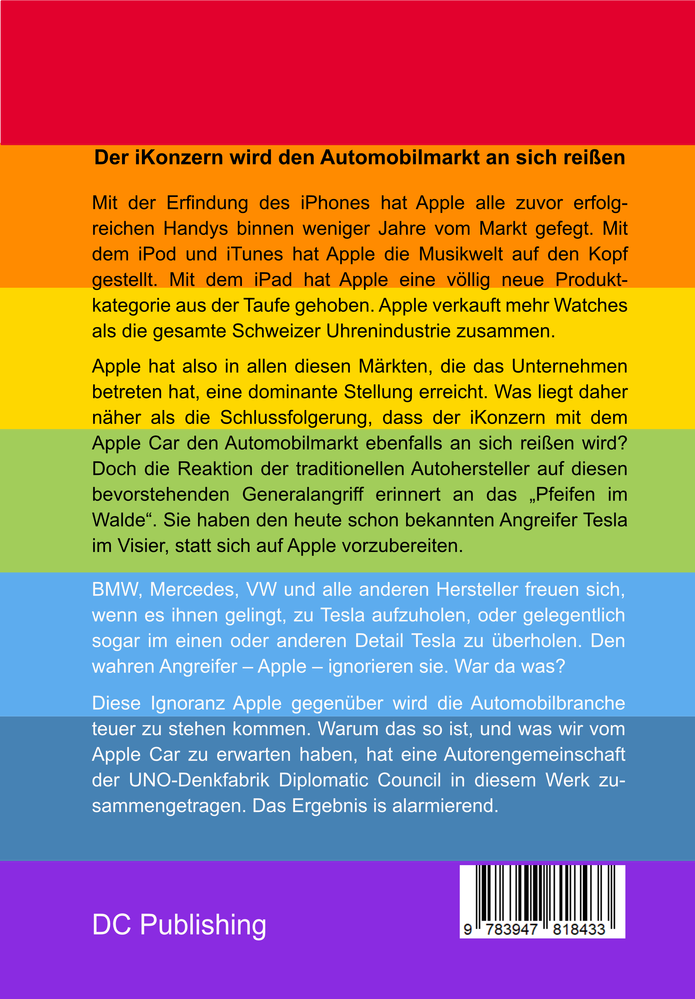 Diese Ignoranz Apple gegenüber wird die Automobilbranche teuer zu stehen kommen. Warum das so ist, und was wir von Apple zu erwarten haben, hat eine Autorengemeinschaft der UNO-Denkfabrik Diplomatic Council in diesem Werk zusammengetragen.