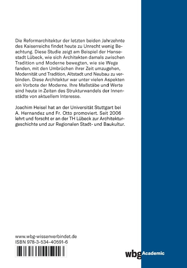 J. Heisel zeigt am Beispiel Lübecks, wie Architekten in den letzten beiden Jahrzehnten des Kaiserreichs Wege fanden, Modernität und Tradition, Altstadt und Neubau zu verbinden. Diese Reformarchitektur ist unter vielen Aspekten ein Vorbote der Moderne. Ihre Maßstäbe sind heute in Zeiten des Strukturwandels der Innenstädte von aktuellem Interesse.sdhfquerhgquhg