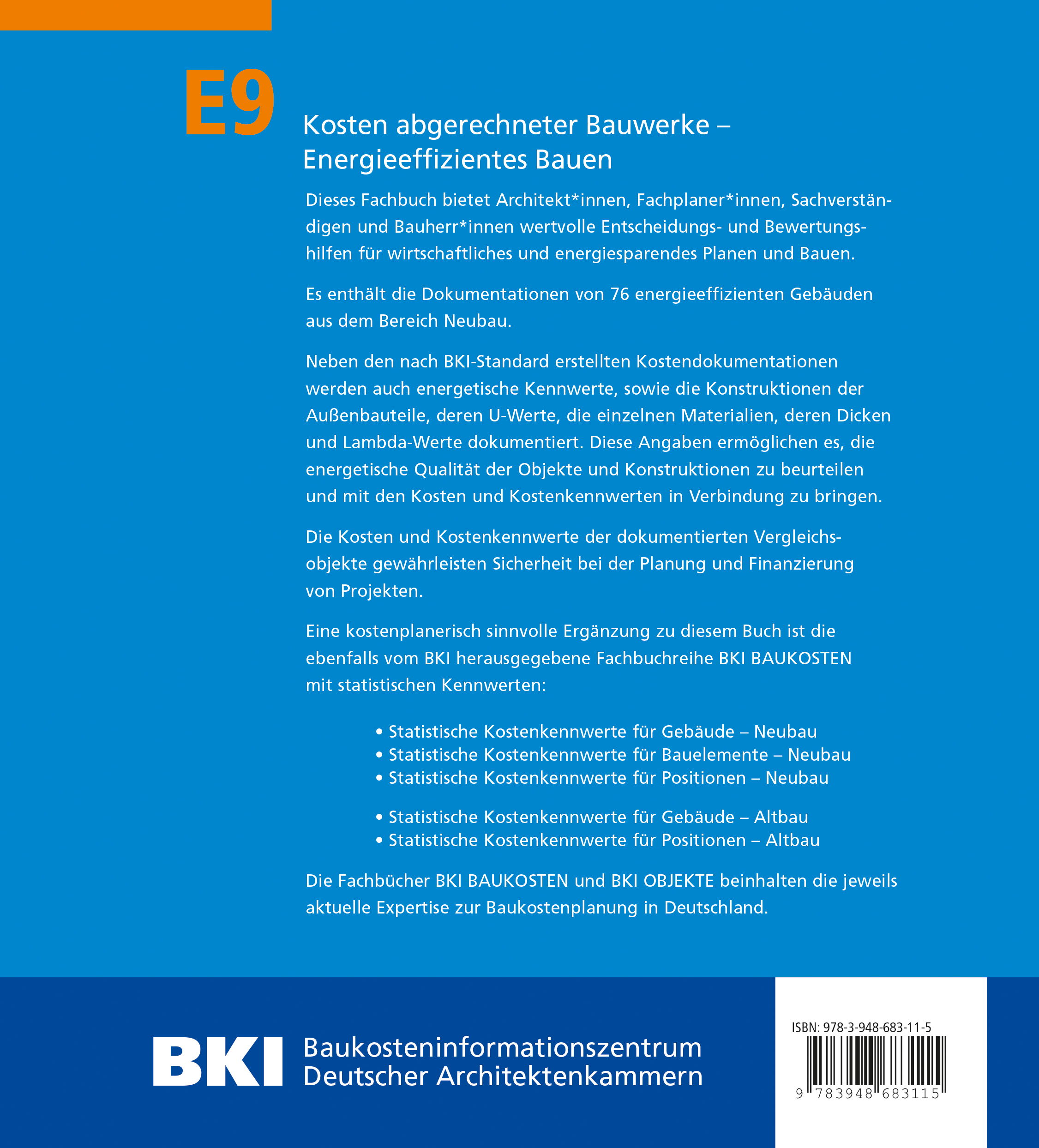 | Schlagworte | Architektur • Baukosten • Bauphysikalische Werte • Energieeffizientes Bauen • Hochbau • Kostenkennwerte • Planungskennwerte |