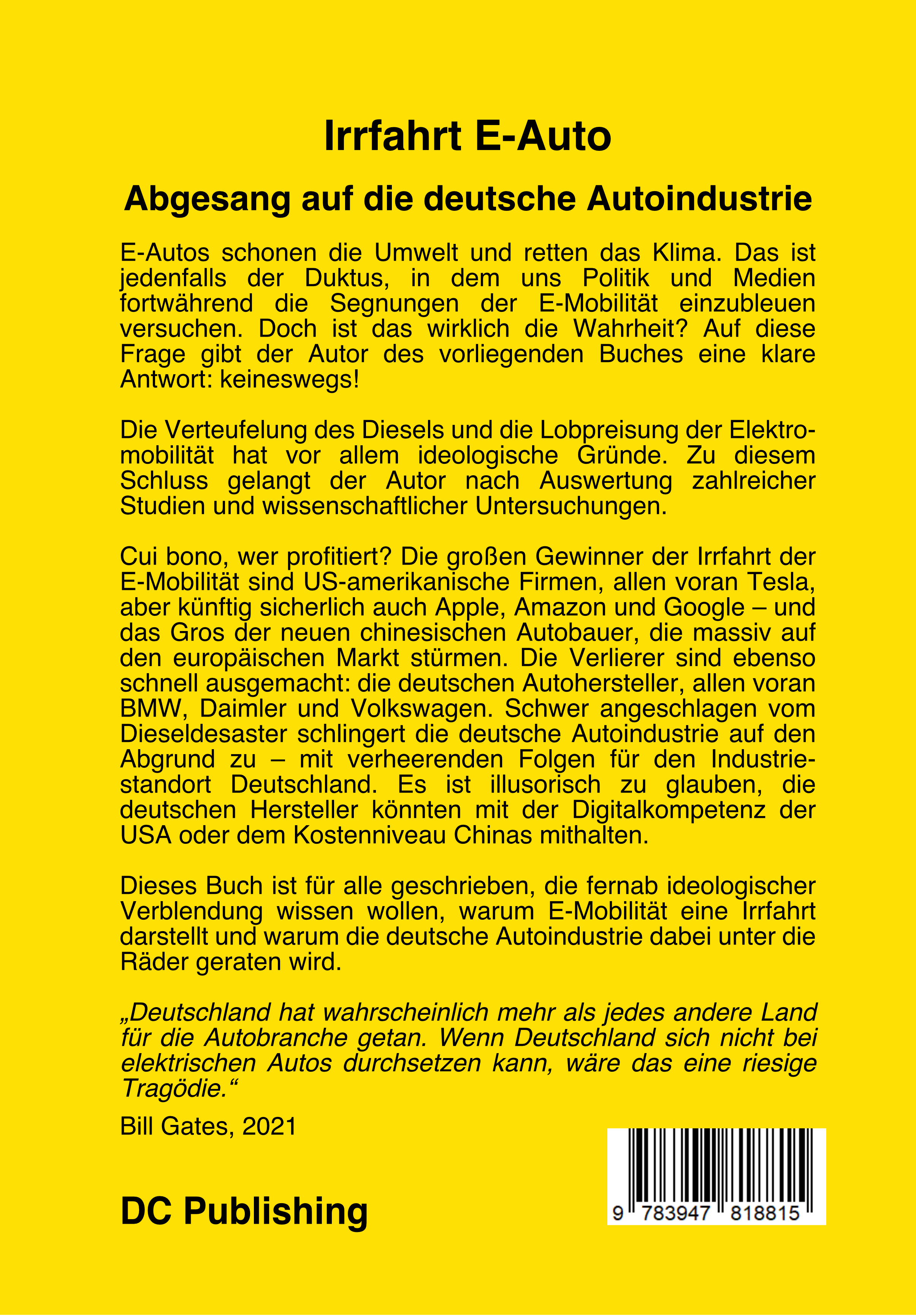 Dieses Buch ist für alle geschrieben, die fernab ideologischer Verblendung wissen wollen, warum E-Mobilität eine Irrfahrt darstellt und warum die deutsche Autoindustrie dabei unter die Räder geraten wird.