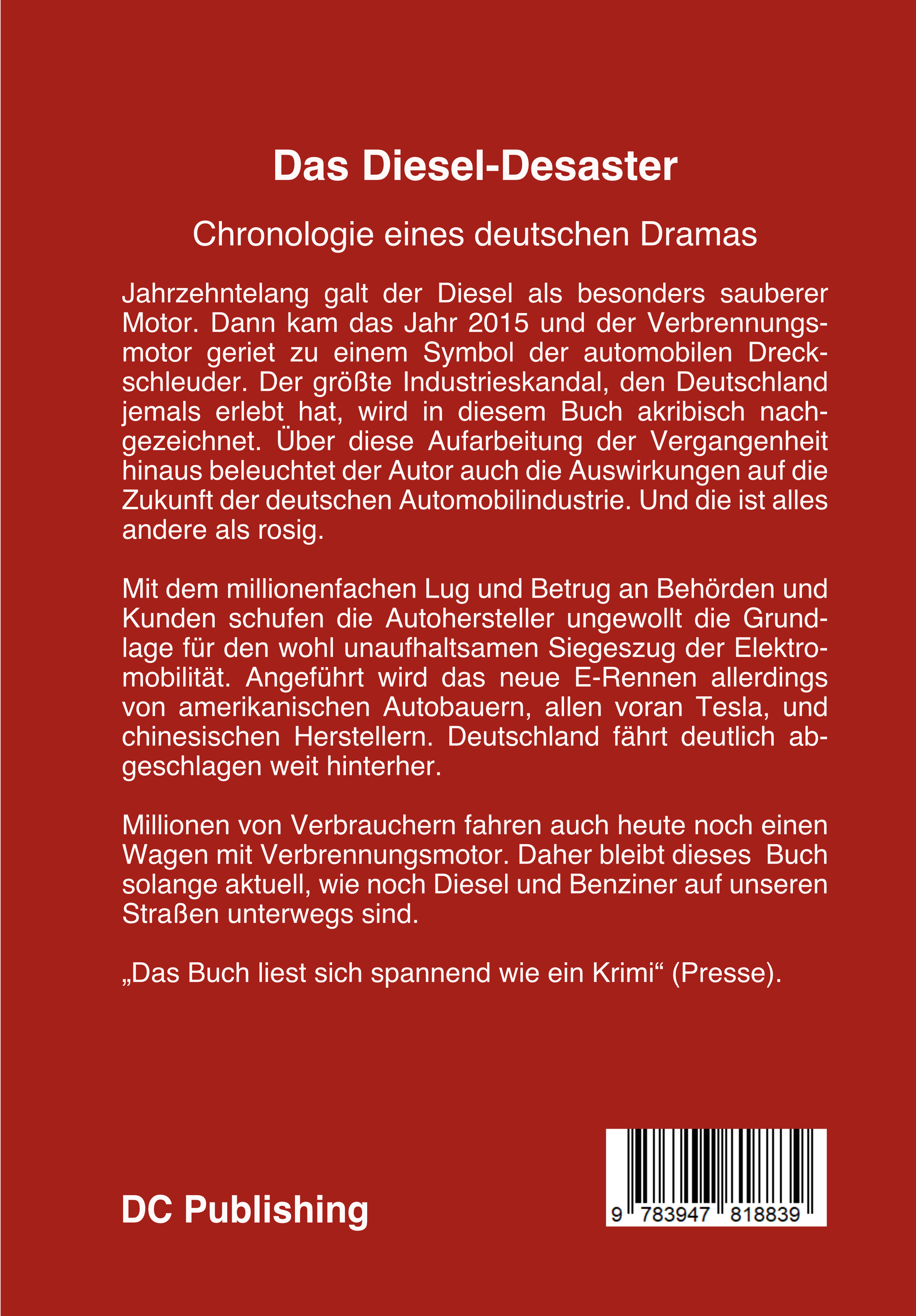 Jahrzehntelang galt der Diesel als besonders sauberer Motor. Dann kam das Jahr 2015 und der Verbrennungsmotor geriet zum Symbol der automobilen Dreckschleuder. Der größte Industrieskandal, den Deutschland jemals erlebt hat, wird in diesem Buch akribisch nachgezeichnet. Neben der Aufarbeitung der Vergangenheit beleuchtet der Autor auch die Auswirkungen auf die Zukunft der deutschen Automobilindustrie. Und die sind alles andere als rosig. Mit dem millionenfachen Lug und Betrug an Behörden und Kunden schufen die Autohersteller ungewollt die Grundlage für den unaufhaltsamen Siegeszug der Elektromobilität. Angeführt wird das neue E-Rennen allerdings von amerikanischen Autobauern, allen voran Tesla, und chinesischen Herstellern. Deutschland fährt weit abgeschlagen hinterher. Millionen von Verbrauchern fahren heute noch einen Wagen mit Verbrennungsmotor. Daher bleibt dieses Buch solange aktuell, wie Diesel und Benziner auf unseren Straßen fahren.