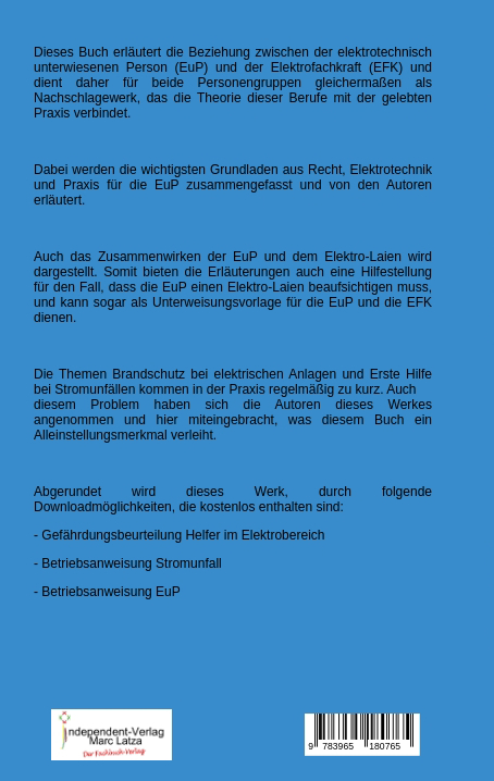 Dieses Buch erläutert die Beziehung zwischen der elektrotechnisch unterwiesene Person (EuP) und der Elektrofachkraft (EFK) und dient daher für beide Personengruppen gleichermaßen als Nachschlagewerk, das die Theorie dieser Berufe mit der gelebten Praxis verbindet. Dabei werden die wichtigsten Grundladen aus Recht, Elektrotechnik und Praxis für die EuP zusammengefasst und von den Autoren erläutert. Auch das Zusammenwirken der EuP und dem Elektro-Laien wird dargestellt. Somit bieten die Erläuterungen auch eine Hilfestellung für den Fall, dass die EuP einen Elektro-Laien beaufsichtigen muss, und kann sogar als Unterweisungsvorlage für die EuP und die EFK dienen. Die Themen Brandschutz bei elektrischen Anlagen und Erste Hilfe bei Stromunfällen kommen in der Praxis regelmäßig zu kurz. Auchdiesem Problem haben sich die Autoren dieses Werkes angenommen und hier miteingebracht, was diesem Buch ein Alleinstellungsmerkmal verleiht.Abgerundet wird dieses Werk, durch folgende Downloadmöglichkeiten, die kostenlos enthalten sind:- Gefährdungsbeurteilung Helfer im Elektrobereich- Betriebsanweisung Stromunfall- Betriebsanweisung EuP