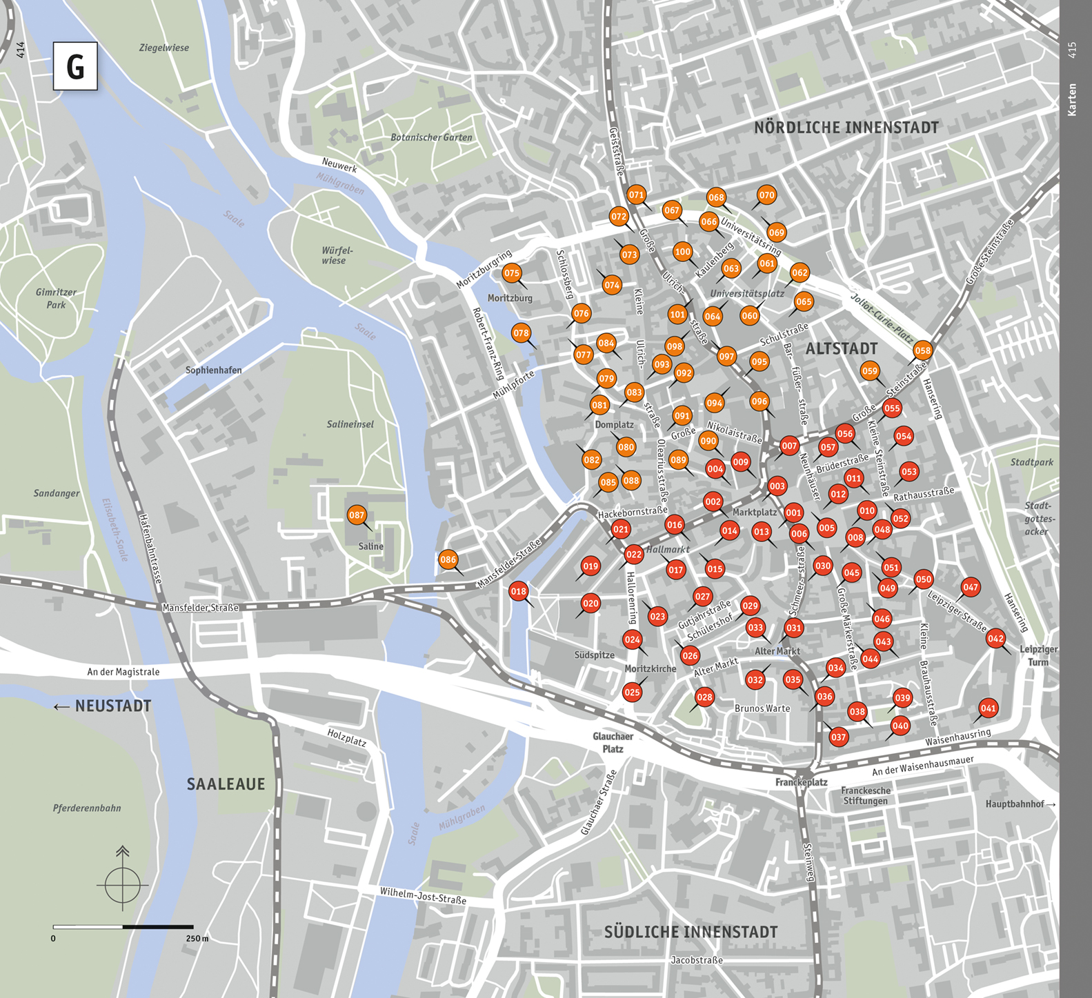 Sachsen-Anhalts größte Stadt bietet eine enorme architektonische Bandbreite: Ihr mittelalterlich geprägter Kern, der expressionistische Maler wie Ernst Ludwig Kirchner inspirierte, gehört ebenso dazu wie die heute städtebaulich stark überformte »romantische« Saalepartie. Gründerzeitquartiere mit ihren Industriebauten finden sich neben Spuren der für die Architektur-, Design- und Kunstentwicklung seit den 1920er Jahren maßgeblichen Kunsthochschule Burg Giebichenstein. Die Ostmoderne schließlich bescherte Halle in den 1960er Jahren eine Art Selbstverdoppelung – mit der Gründung von Halle-Neustadt, einer der größten modernistischen Neubausiedlungen in ganz Deutschland.