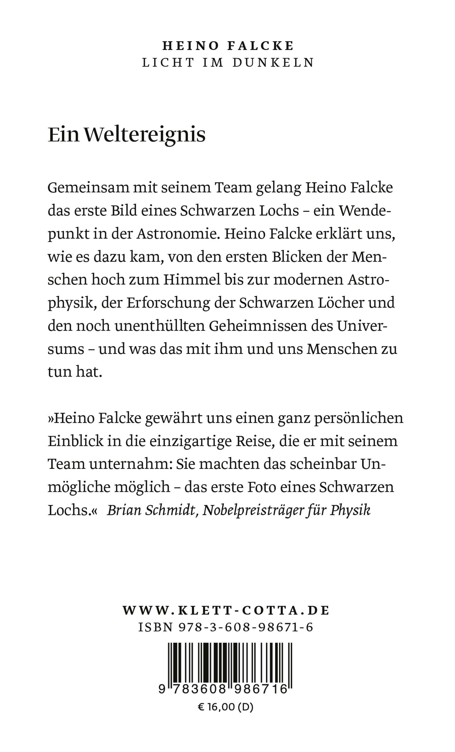 »Heino Falcke gewährt uns einen ganz persönlichen Einblick in die einzigartige Reise, die er mit seinem Team unternahm: Sie machten das scheinbar Unmögliche möglich - das erste Foto eines Schwarzen Lochs.« Brian Schmidt, Nobelpreisträger für Physik