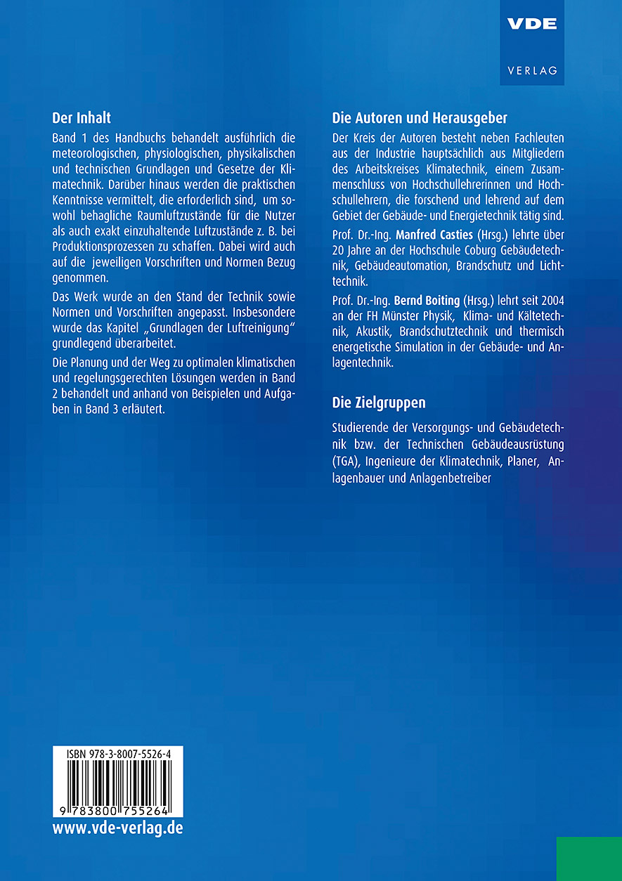 Band 1 des Handbuchs behandelt ausführlich die meteorologischen, physiologischen, physikalischen und technischen Grundlagen und Gesetze der Klimatechnik. Darüber hinaus werden die praktischen Kenntnisse vermittelt, die erforderlich sind, um sowohl behagliche Raumluftzustände für die Nutzer als auch exakt einzuhaltende Luftzustände z. B. bei Produktionsprozessen zu schaffen. Dabei wird auch auf die jeweiligen Vorschriften und Normen Bezug genommen.Das Werk wurde an den Stand der Technik sowie Normen und Vorschriften angepasst. Insbesondere wurde das Kapitel "Grundlagen der Luftreinigung" grundlegend überarbeitet.Die Planung und der Weg zu optimalen klimatischen und regelungsgerechten Lösungen werden in Band 2 behandelt und anhand von Beispielen und Aufgaben in Band 3 erläutert.