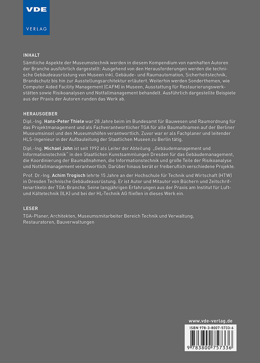 Dipl.-Ing. Thiele war im Bundesamt für Bauwesen und Raumordnung für das Projektmanagement und als Fachverantwortlicher TGA für alle Baumaßnamen auf der Berliner Museumsinsel und den Museumshöfen verantwortlich. Dipl.-Ing. Michael John ist seit 1992 in den Staatlichen Kunstsammlungen Dresden für das Gebäudemanagement, die Koordinierung der Baumaßnahmen, die Informationstechnik und große Teile der Risikoanalyse und Notfallmanagement verantwortlich. Prof. Dr.-Ing. Trogisch lehrte 15 Jahre an der Hochschule für Technik und Wirtschaft (HTW) in Dresden Technische Gebäudeausrüstung.