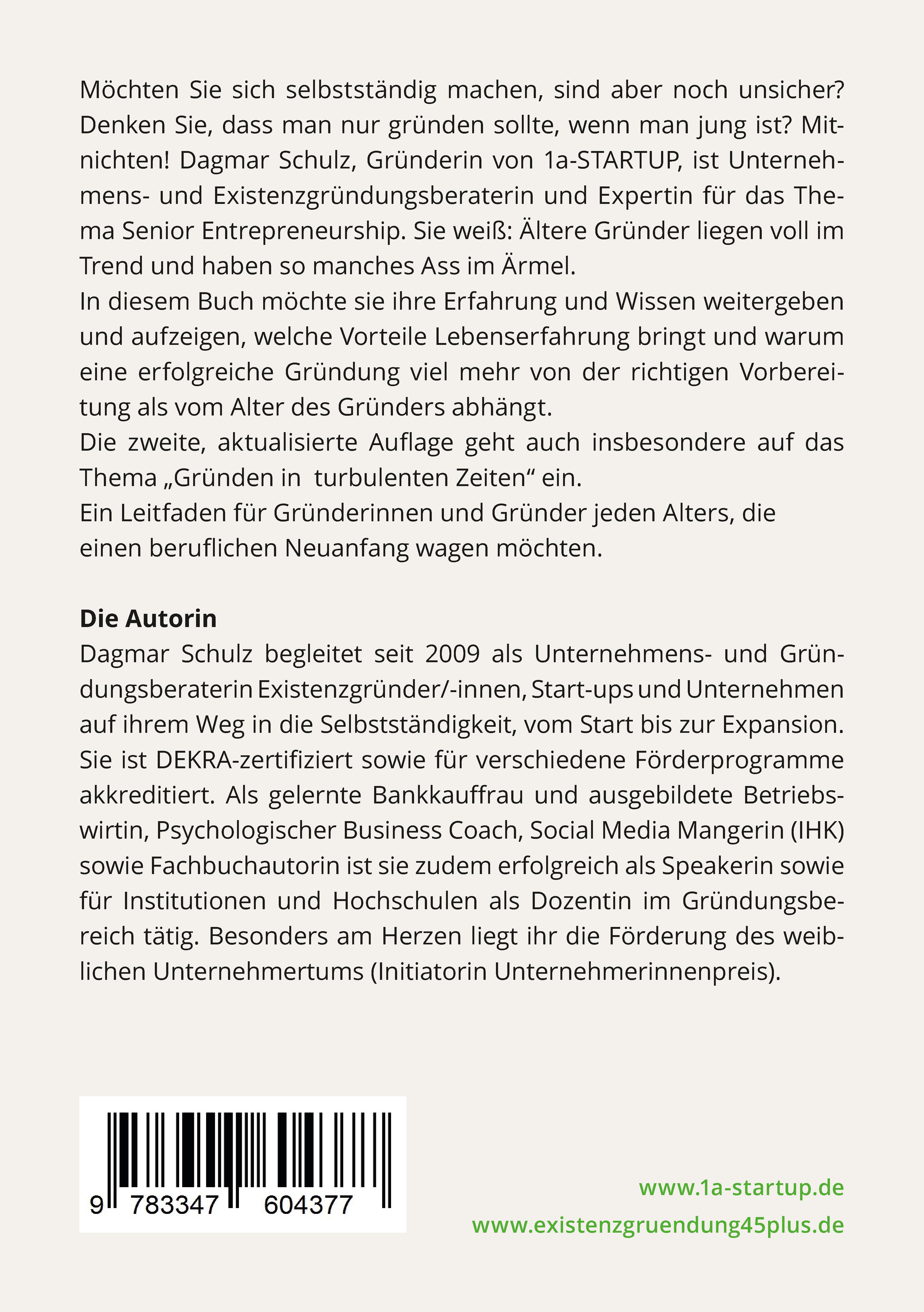 Dagmar Schulz (Jahrgang 1970) ist Gründerin von 1a-STARTUP und aus ganzem Herzen Düsseldorferin. Seit 2009 berät sie als selbstständige Unternehmens- und Existenzgründungsberaterin angehende Selbstständige und begleitet sie bei ihrem beruflichen Neuanfang. Durch die stetig wachsende Anzahl älterer Gründerinnen und Gründer sowie durch ihre Arbeit in diversen Expertenkreisen und der Mitarbeit an verschiedenen Studien hat die ausgebildete Bankkauffrau, Sparkassenbetriebswirtin, Psychologischer Businesscoach und Social Media Managerin in den vergangenen Jahren umfassende Erfahrung im Bereich Senior Entrepreneurship gesammelt. Ihr Wissen gibt sie nun in einem praxisnahen Ratgeber – besonders, aber nicht nur – für ältere Gründer weiter.