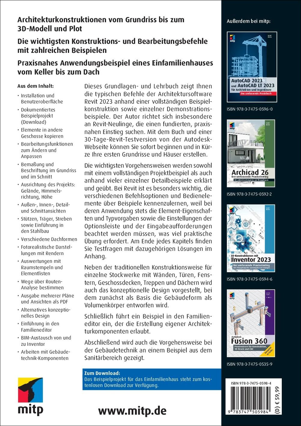 | Schlagworte | 3D Modell • Architekt • Architektur • Autodesk • Autodesk Revit • Bemaßung • Buch • CAD • CAD Programm • Design • Grundriss • haus zeichnen • Konstruktion • mitp • Pläne • pläne zeichnen • Rendern • Revit • revit 2023 • Revit architecture • revit testversion • Tragwerk • Volumenkörper |