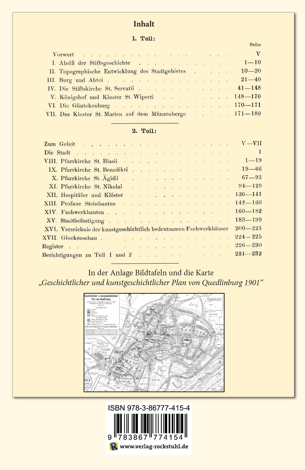 [XXXIII. HEFT] - Beschreibende Darstellung der älteren Bau- und Kunstdenkmäler der Provinz Sachsen und der angrenzenden Gebiete 1922/23, Reprint, 33. Heft. 496 Seiten, 368 Abbildungen, 21 x 14,8 cm, Historischen Commission der Provinz Sachsen, FESTEINBAND."Geschichtlicher und kunstgeschichtlicher Plan von Quedlinburg" von 1909 wurde im Buch in s/w auf 18 Seiten mit eingedruckt. INHALT:Teil 1:VorwortI. Abriß der StiftsgeschichteII. Topographische Entwicklung des StadtgebietesIII. Burg und AbteiIV. Die Stiftskirche St. ServatiiV. Die GüntekenburgVII. Das Kloster St. Marien auf dem MünzenbergeTeil 2:InhaltVolltextsucheTitelblattV-VII Zum Geleit1 Die Stadt1-19 VIII. Pfarrkirche St. Blasii19-66 IX. Pfarrkirche St. Benedikti67-93 X. Pfarrkirche St. Ägidii94-129 XI. Pfarrkirche St. Nikolai in der Neustadt130-141 XII. Die Hospitäler St. Johannis, St. Spiritus und St. Annae142-160 XIII. Profane Steinbauten160-182 XIV. Fachwerkbauten183-199 XV. Stadtbefestigung200-223 XVI. Verzeichnis der kunstgeschichtlich bedeutsamen Fachwerkhäuser224-225 XVII. Glockenschau226-230 Register231-232 Berichtigungen zu Teil 1 und 2Teil 2 Tafeln und Karte