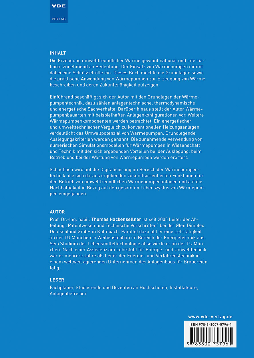 Die Erzeugung von umweltfreundlicher Wärme gewinnt national und international zunehmend an Bedeutung. Der Einsatz von Wärmepumpen nimmt dabei eine Schlüsselrolle ein. Dieses Buch möchte die Grundlagen sowie die praktische Anwendung von Wärmepumpen zur Erzeugung von Wärme beschreiben und deren Zukunftsfähigkeit aufzeigen.