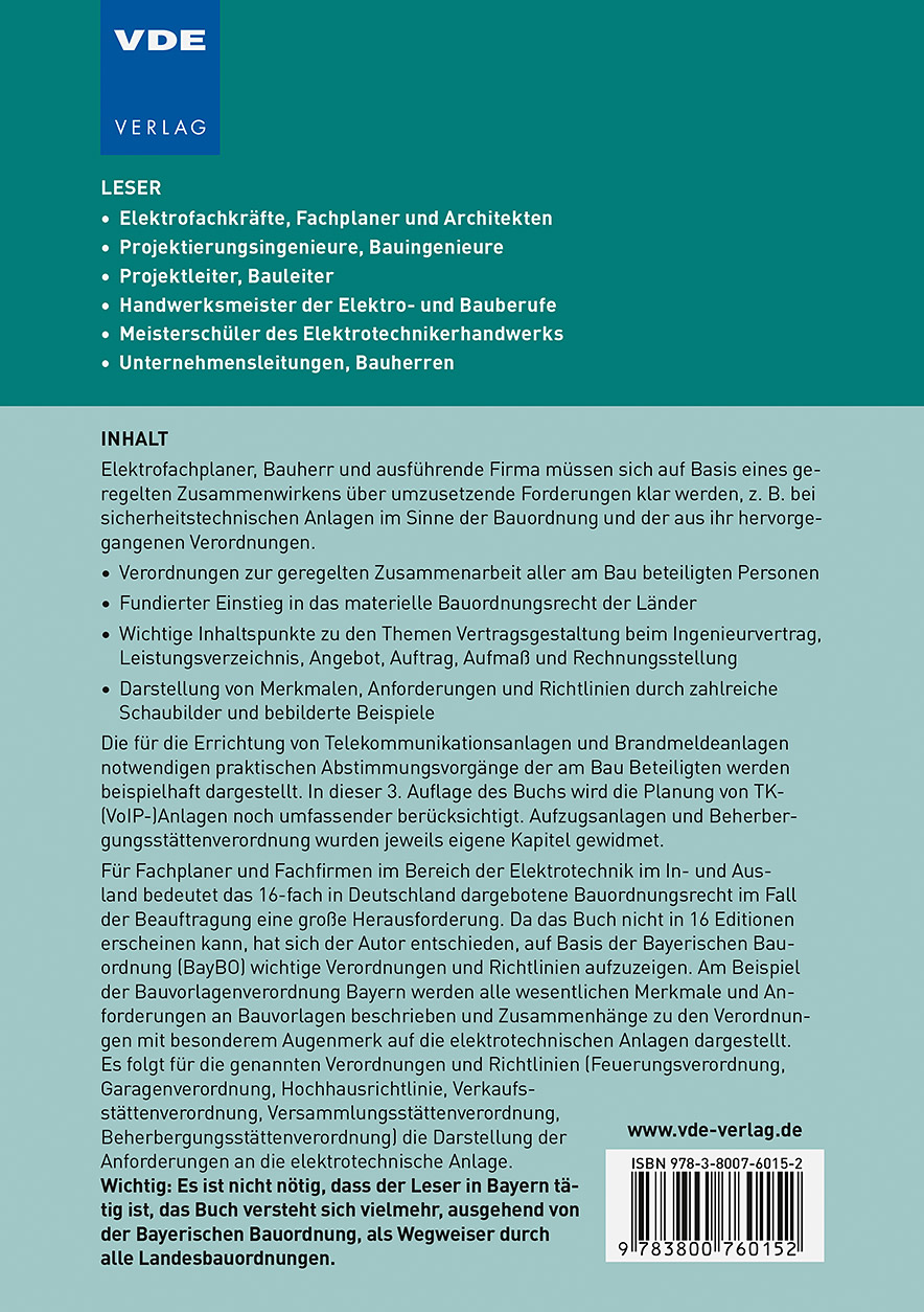 Elektrofachplaner, Bauherr und ausführende Firma müssen sich auf Basis eines geregelten Zusammenwirkens über umzusetzende Forderungen klar werden, z. B. bei sicherheitstechnischen Anlagen im Sinne der Bauordnung und der aus ihr hervorgegangenen Verordnungen.- Verordnungen zur geregelten Zusammenarbeit aller am Bau beteiligten Personen- Fundierter Einstieg in das materielle Bauordnungsrecht der Länder- Wichtige Inhaltspunkte zu den Themen Vertragsgestaltung beim Ingenieurvertrag, Leistungsverzeichnis, Angebot, Auftrag, Aufmaß und Rechnungsstellung- Darstellung von Merkmalen, Anforderungen und Richtlinien durch zahlreiche Schaubilder und bebilderte BeispieleDie für die Errichtung von Telekommunikationsanlagen und Brandmeldeanlagen notwendigen praktischen Abstimmungsvorgänge der am Bau Beteiligten werden beispielhaft dargestellt. In dieser 3. Auflage des Buchs wird die Planung von TK-(VoIP-)Anlagen noch umfassender berücksichtigt. Aufzugsanlagen und Beherbergungsstättenverordnung wurden jeweils eigene Kapitel gewidmet.Für Fachplaner und Fachfirmen im Bereich der Elektrotechnik im In- und Ausland bedeutet das 16-fach in Deutschland dargebotene Bauordnungsrecht im Fall der Beauftragung eine große Herausforderung. Da das Buch nicht in 16 Editionen erscheinen kann, hat sich der Autor entschieden, auf Basis der Bayerischen Bauordnung (BayBO) wichtige Verordnungen und Richtlinien aufzuzeigen. Am Beispiel der Bauvorlagenverordnung Bayern werden alle wesentlichen Merkmale und Anforderungen an Bauvorlagen beschrieben und Zusammenhänge zu den Verordnungen mit besonderem Augenmerk auf die elektrotechnischen Anlagen dargestellt. Es folgt für die genannten Verordnungen und Richtlinien (Feuerungsverordnung, Garagenverordnung, Hochhausrichtlinie, Verkaufsstättenverordnung, Versammlungsstättenverordnung, Beherbergungsstättenverordnung) die Darstellung der Anforderungen an die elektrotechnische Anlage.Wichtig: Es ist nicht nötig, dass der Leser in Bayern tätig ist, das Buch versteht sich vielmehr, ausgehend von der Bayerischen Bauordnung, als Wegweiser durch alle Landesbauordnungen.