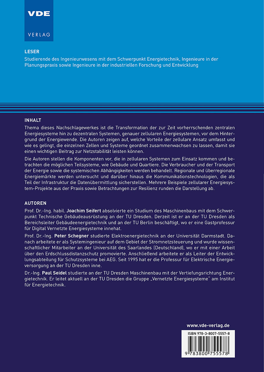 Thema dieses Nachschlagewerkes ist die Transformation der zur Zeit vorherrschenden zentralen Energiesysteme hin zu dezentralen Systemen, genauer zellularen Energiesystemen, vor dem Hintergrund der Energiewende. Die Autoren zeigen auf, welche Vorteile der zellulare Ansatz umfasst und wie es gelingt, die einzelnen Zellen und Systeme geordnet zusammenwachsen zu lassen, damit sie einen wichtigen Beitrag zur Netzstabilität leisten können.Die Autoren stellen die Komponenten vor, die in zellularen Systemen zum Einsatz kommen und betrachten die möglichen Teilsysteme, wie Gebäude und Quartiere. Die Verbraucher und der Transport der Energie sowie die systemischen Abhängigkeiten werden behandelt. Regionale und überregionale Energiemärkte werden untersucht und darüber hinaus die Kommunikationstechnologien, die als Teil der Infrastruktur die Datenübermittlung sicherstellen. Mehrere Beispiele zellularer Energiesystem-Projekte aus der Praxis sowie Betrachtungen zur Resilienz runden die Darstellung ab.