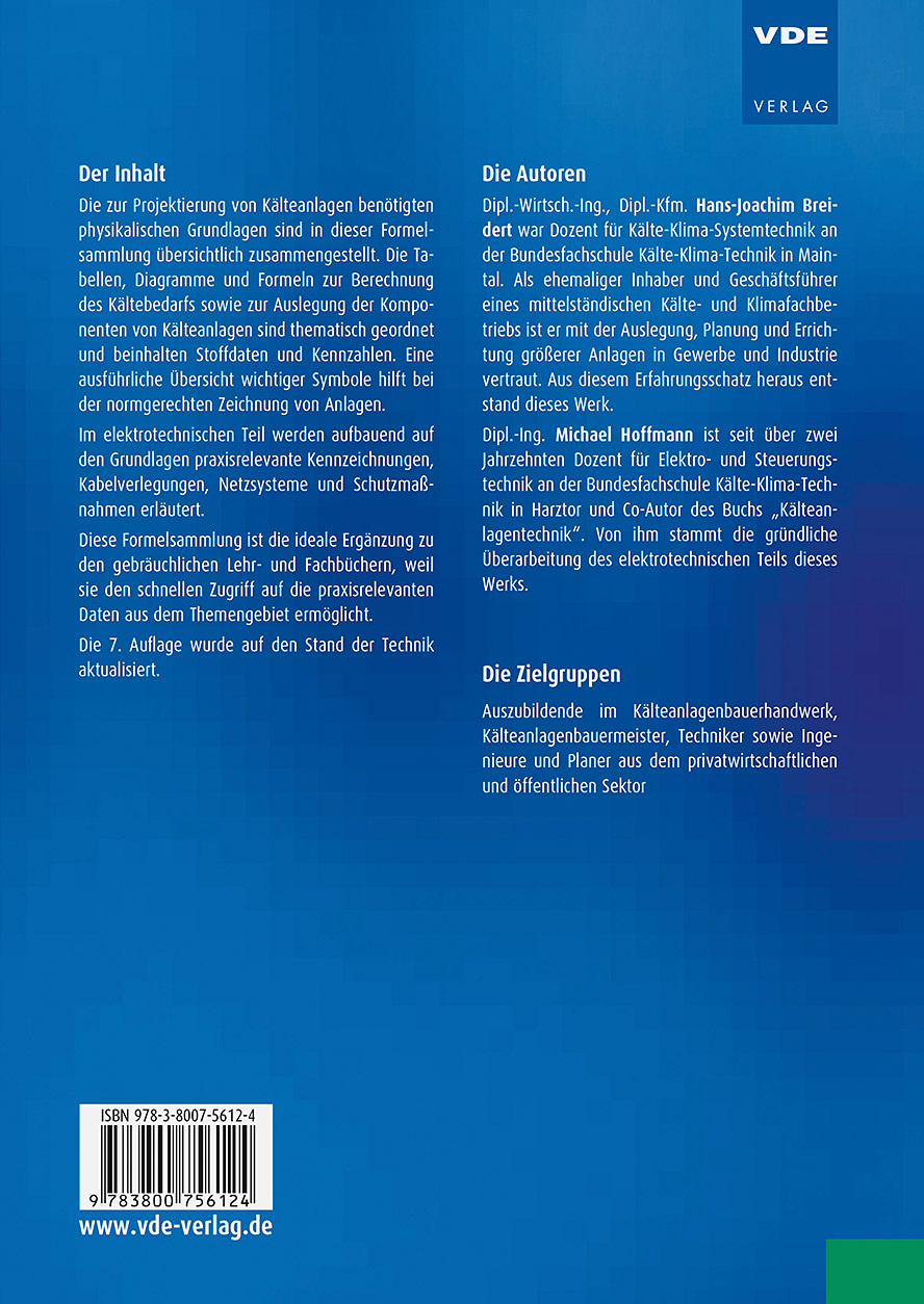 Die zur Projektierung von Kälteanlagen benötigten physikalischen Grundlagen sind in dieser Formelsammlung übersichtlich zusammengestellt. Die Tabellen, Diagramme und Formeln zur Berechnung des Kältebedarfs sowie zur Auslegung der Komponenten von Kälteanlagen sind thematisch geordnet und beinhalten Stoffdaten und Kennzahlen. Eine ausführliche Übersicht wichtiger Symbole hilft bei der normgerechten Zeichnung von Anlagen.
