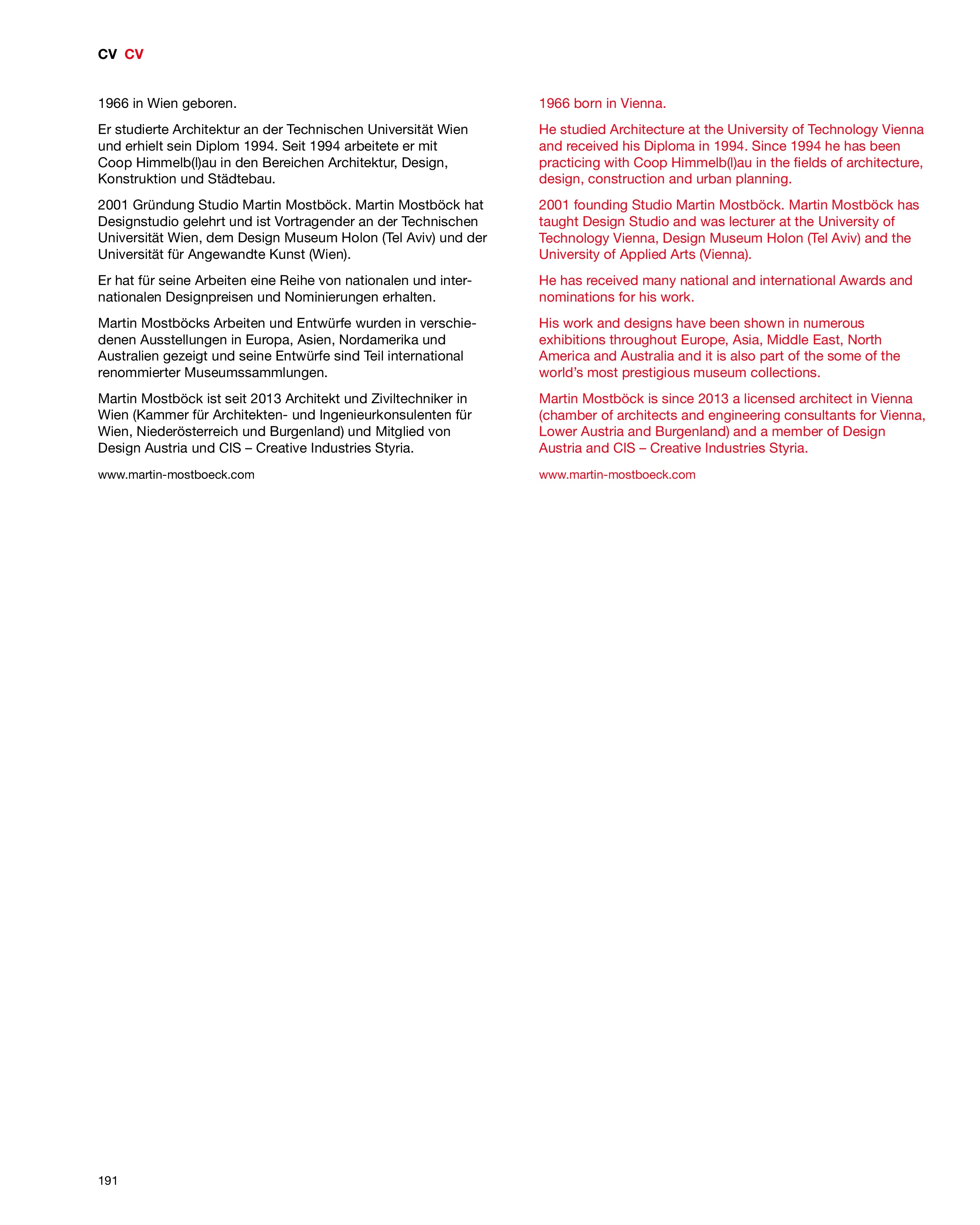 Martin Mostböck studierte Architektur. Seit 1994 arbeitete er mit Coop Himmelb(l)au in den Bereichen Architektur, Design, Konstruktion und Städtebau. 2001 Gründung des eigenen Studios.
