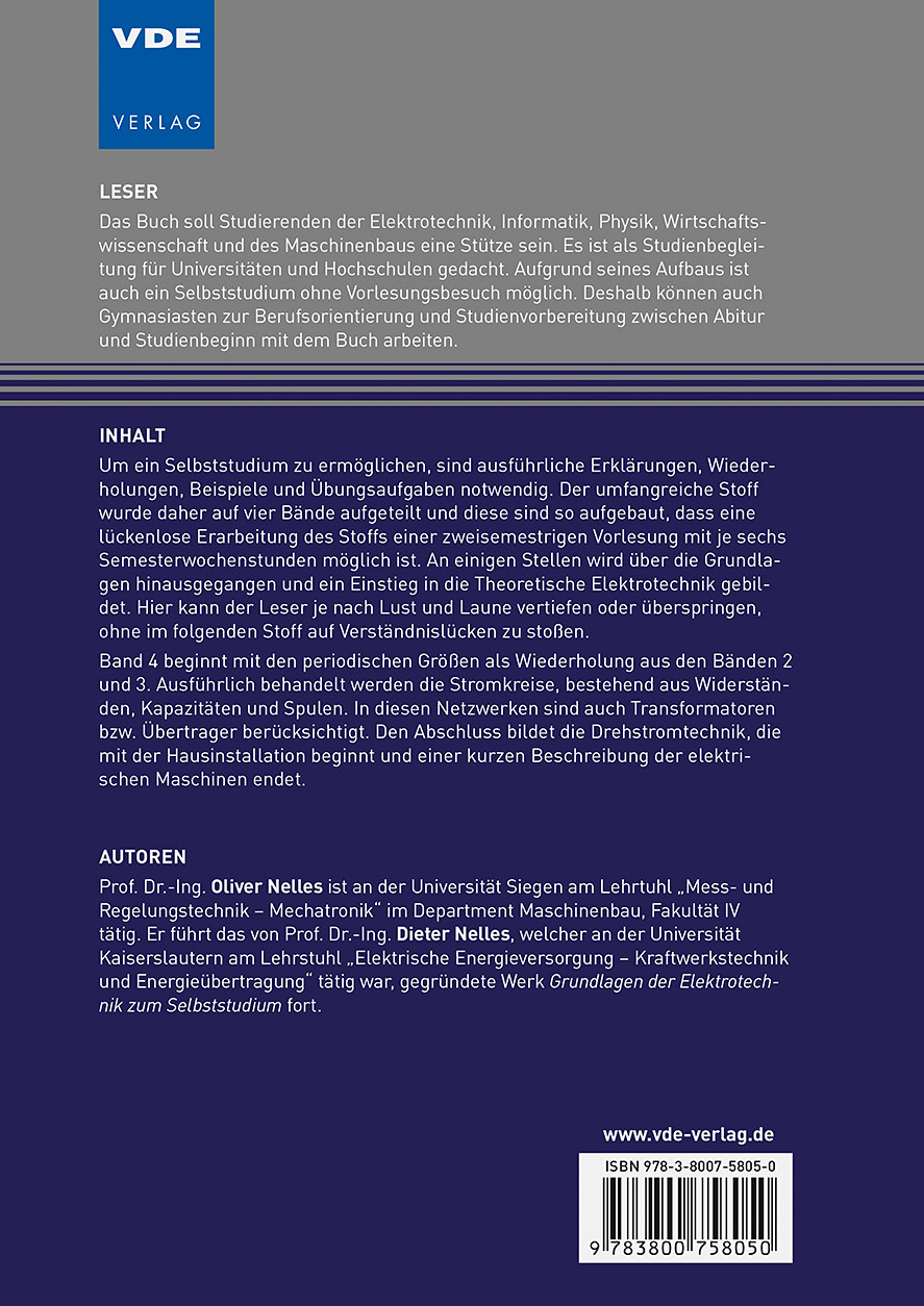 Der Band 4 beginnt mit den periodischen Größen als Wiederholung aus den Bänden 2 und 3. Ausführlich behandelt werden die Stromkreise, bestehend aus Widerständen, Kapazitäten und Spulen. In diesen Netzwerken sind auch Transformatoren bzw. Übertrager berücksichtigt. Den Abschluss bildet die Drehstromtechnik, die mit der Hausinstallation beginnt und einer kurzen Beschreibung der elektrischen Maschinen endet.