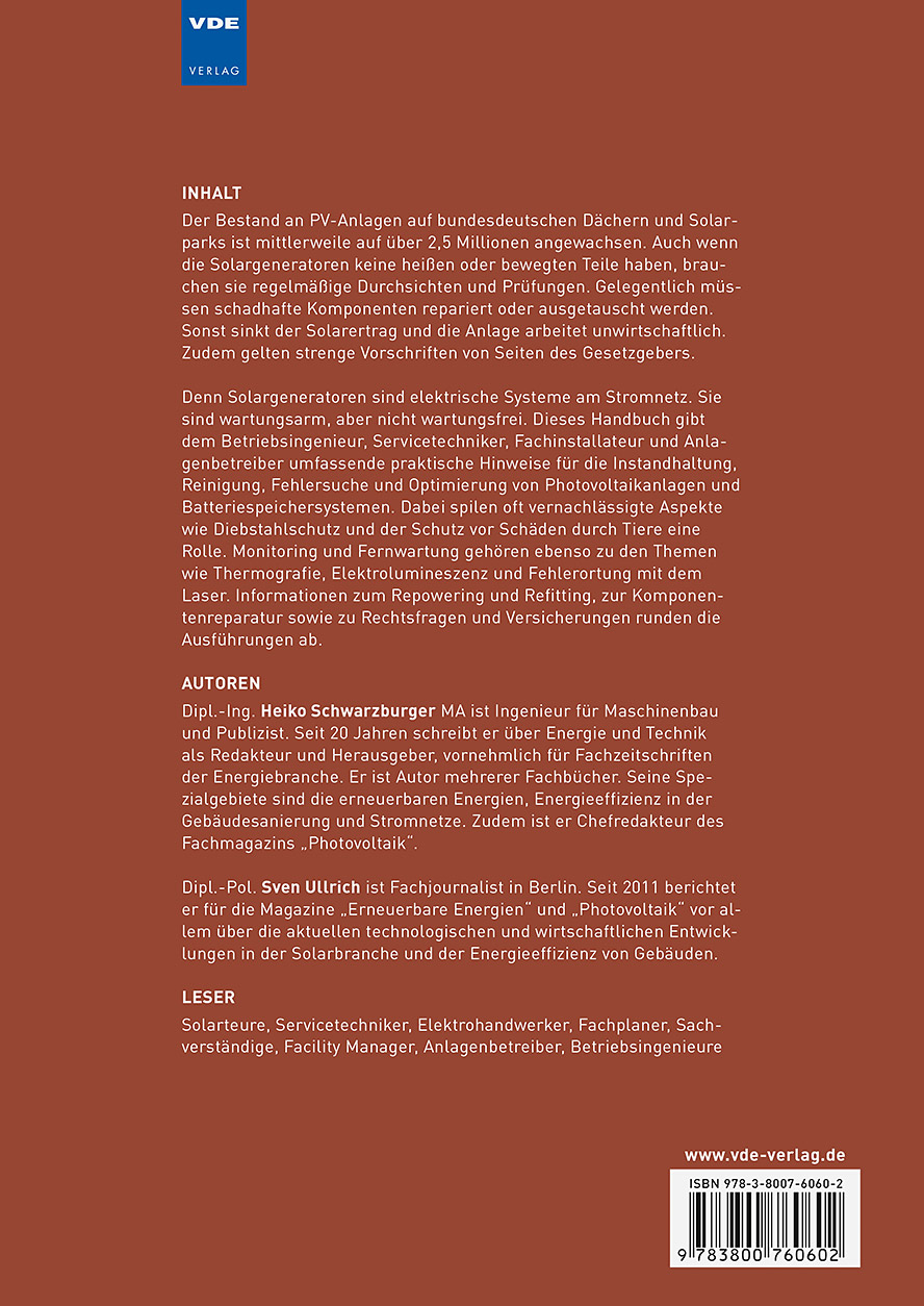Denn Solargeneratoren sind elektrische Systeme am Stromnetz. Sie sind wartungsarm, aber nicht wartungsfrei. Dieses Handbuch gibt dem Betriebsingenieur, Servicetechniker, Fachinstallateur und Anlagenbetreiber umfassende praktische Hinweise für die Instandhaltung, Reinigung, Fehlersuche und Optimierung von Photovoltaikanlagen und Batteriespeichersystemen. Dabei spielen oft vernachlässigte Aspekte wie Diebstahlschutz und der Schutz vor Schäden durch Tiere eine Rolle. Monitoring und Fernwartung gehören ebenso zu den Themen wie Thermografie, Elektrolumineszenz und Fehlerortung mit dem Laser. Informationen zum Repowering und Refitting, zur Komponentenreparatur sowie zu Rechtsfragen und Versicherungen runden die Ausführungen ab.