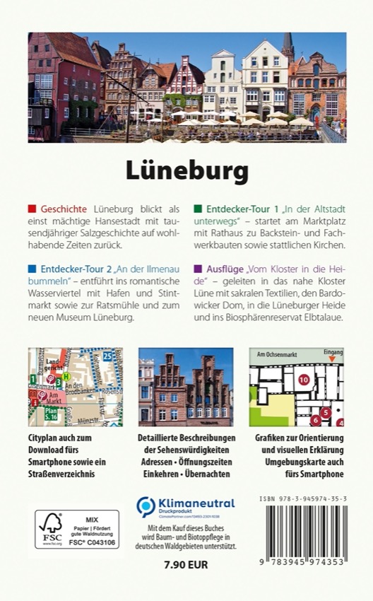 In zwei übersichtlich gestalteten Entdecker-Touren führt der Stadtführer Lüneburg zu diesen historischen aber auch zu den modernen Sehenswürdigkeiten der Hansestadt bis hin zu den Drehorten der Fernsehserie Rote Rosen mit detaillierten Beschreibungen, einer Vielzahl von Farbfotos, Grundrissen und praktischen Hinweisen zu Öffnungszeiten und Adressen sowie Einkehr- und Übernachtungsmöglichkeiten. Zur Orientierung dient ein hochwertiger Cityplan mit Straßenverzeichnis, der auch auf das Smartphone geladen werden kann. Tipps für kleine und große Ausflüge in die Umgebung führen beispielsweise in die Lüneburger Heide oder das UNESCO-Biosphärenreservat Elbtalaue. Eine Rad- und Wanderkarte hält Touren für die aktive Erkundung rund um die Hansestadt bereit, zum Beispiel nach Bardowick auf der Backstein-Radroute.