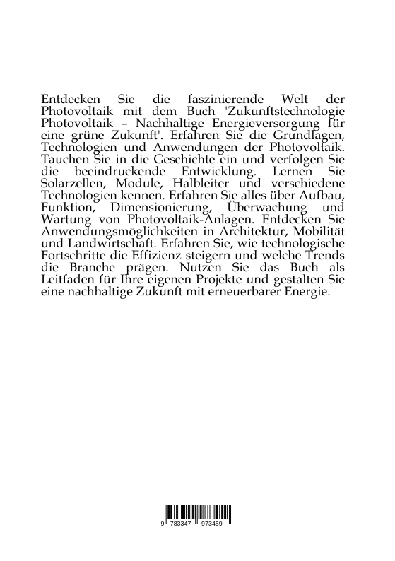 Entdecken Sie die faszinierende Welt der Photovoltaik mit dem umfassenden Buch 'Zukunftstechnologie Photovoltaik - Nachhaltige Energieversorgung für eine grüne Zukunft'. In diesem Buch erhalten Sie einen fundierten Einblick in die verschiedenen Aspekte der Photovoltaik, von den grundlegenden Konzepten bis hin zu innovativen Technologien und zukunftsweisenden Anwendungen.Erfahren Sie, wie Photovoltaik in der heutigen Welt von großer Bedeutung und Relevanz ist und wie sie einen wesentlichen Beitrag zur nachhaltigen Energiezukunft leisten kann. Tauchen Sie ein in die Geschichte der Photovoltaik und verfolgen Sie ihre beeindruckende Entwicklung im Laufe der Zeit.Lernen Sie die Grundlagen der Photovoltaik kennen, angefangen von der Funktionsweise von Solarzellen und Photovoltaik-Modulen bis hin zum Aufbau und den Eigenschaften von Halbleitern. Erfahren Sie mehr über die vielfältigen Einflussfaktoren, die die Effizienz von Solarzellen beeinflussen, und entdecken Sie die verschiedenen Technologien wie monokristalline, polykristalline, Dünnschicht-, organische und Perowskit-Solarzellen.Erfahren Sie alles über den Aufbau und die Funktion von Photovoltaik-Anlagen, die Netzeinspeisung und den Eigenverbrauch. Entdecken Sie die Dimensionierung von PV-Anlagen und die wichtigsten Aspekte wie Leistungsbedarf, Flächenanforderungen und Netzausbaukosten. Erfahren Sie, wie Sie Ihre Photovoltaik-Anlage überwachen und warten können, und entdecken Sie die vielfältigen Anwendungsmöglichkeiten, von der Integration in Architektur und Mobilität bis hin zur Landwirtschaft.Erfahren Sie, wie technologische Fortschritte die Effizienz von Solarzellen steigern und welche Trends die Photovoltaik-Branche prägen. Entdecken Sie die Potenziale der Photovoltaik für eine nachhaltige Energiezukunft und lassen Sie sich von einem berechneten Beispiel für eine Photovoltaikanlage inspirieren.Dieses Buch ist ein wertvoller Begleiter für Einsteiger und Fortgeschrittene in der Photovoltaik. Es bietet eine umfassende und verständliche Darstellung der Grundlagen, Technologien und Anwendungen. Nutzen Sie dieses Buch als Leitfaden für Ihre eigenen Photovoltaik-Projekte und gestalten Sie eine nachhaltige Zukunft mit erneuerbarer Energie."Beginnen Sie noch heute Ihre Reise in die Welt der Photovoltaik mit dem Buch 'Zukunftstechnologie Photovoltaik - Nachhaltige Energieversorgung für eine grüne Zukunft'