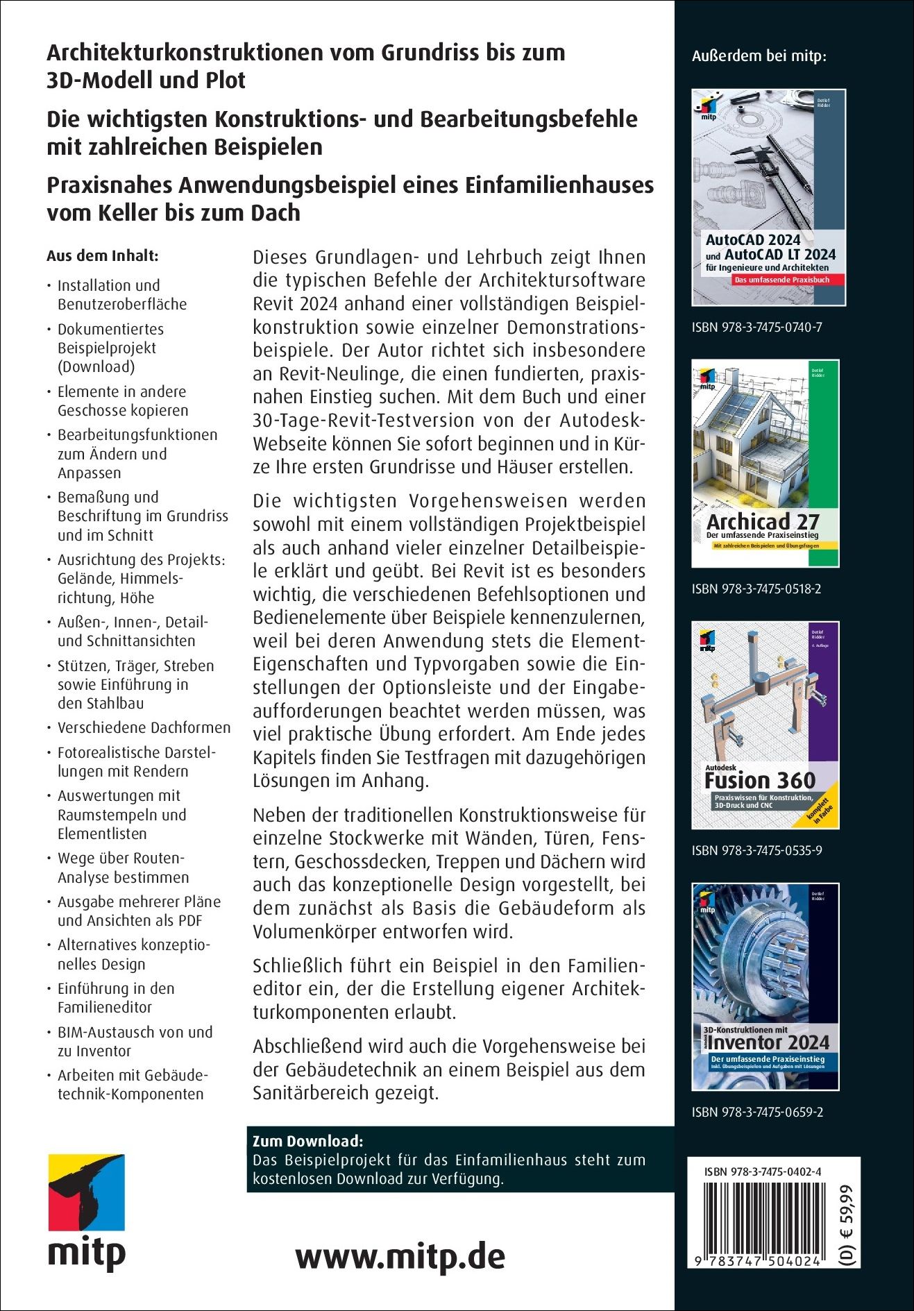 Dieses Grundlagen- und Lehrbuch zeigt Ihnen die typischen Befehle der Architektursoftware Revit 2024 anhand einer vollständigen Beispielkonstruktion sowie einzelner Demonstrationsbeispiele. Der Autor richtet sich insbesondere an Revit-Neulinge, die einen fundierten, praxisnahen Einstieg suchen. Mit dem Buch und einer 30-Tage-Revit-Testversion von der Autodesk-Webseite können Sie sofort beginnen und in Kürze Ihre ersten Grundrisse und Häuser erstellen.