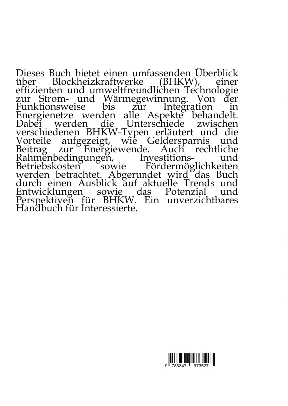 Blockheizkraftwerke (BHKW) sind eine interessante Alternative für die Strom- und Wärmeversorgung von Gebäuden und Industrieanlagen. Sie bieten zahlreiche Vorteile gegenüber herkömmlichen Energieversorgungssystemen und haben ein großes Potenzial für die Energiewende.Dieses Buch gibt einen umfassenden Überblick über BHKW und deren Einsatzmöglichkeiten. Es beschreibt die Funktionsweise von BHKW und die Unterschiede zwischen verschiedenen BHKW-Typen. Auch die verschiedenen Betriebsarten von BHKW werden erklärt.Die ökologischen Vorteile werden betrachtet. Auch die Möglichkeiten, mit einem BHKW Geld zu sparen, werden aufgezeigt.Die rechtlichen Rahmenbedingungen für den Einsatz von BHKW werden ebenfalls behandelt. Neben den Einsatzmöglichkeiten und der Integration in Energienetze werden auch die Investitions- und Betriebskosten von BHKW betrachtet. Zudem werden die verschiedenen Fördermöglichkeiten für BHKW aufgezeigt.Welche aktuellen Trends und Entwicklungen im Bereich BHKW. Auch das Potenzial und die Perspektiven von BHKW im Rahmen der Energiewende werden diskutiert.Dieses Buch richtet sich an alle, die sich für eine umweltfreundliche und effiziente Energieversorgung interessieren, sei es aus privatem oder aus geschäftlichem Interesse. Es bietet einen umfassenden Überblick über BHKW und ist somit ein wichtiger Ratgeber für alle, die eine Entscheidung über die Einführung eines BHKW treffen möchten.