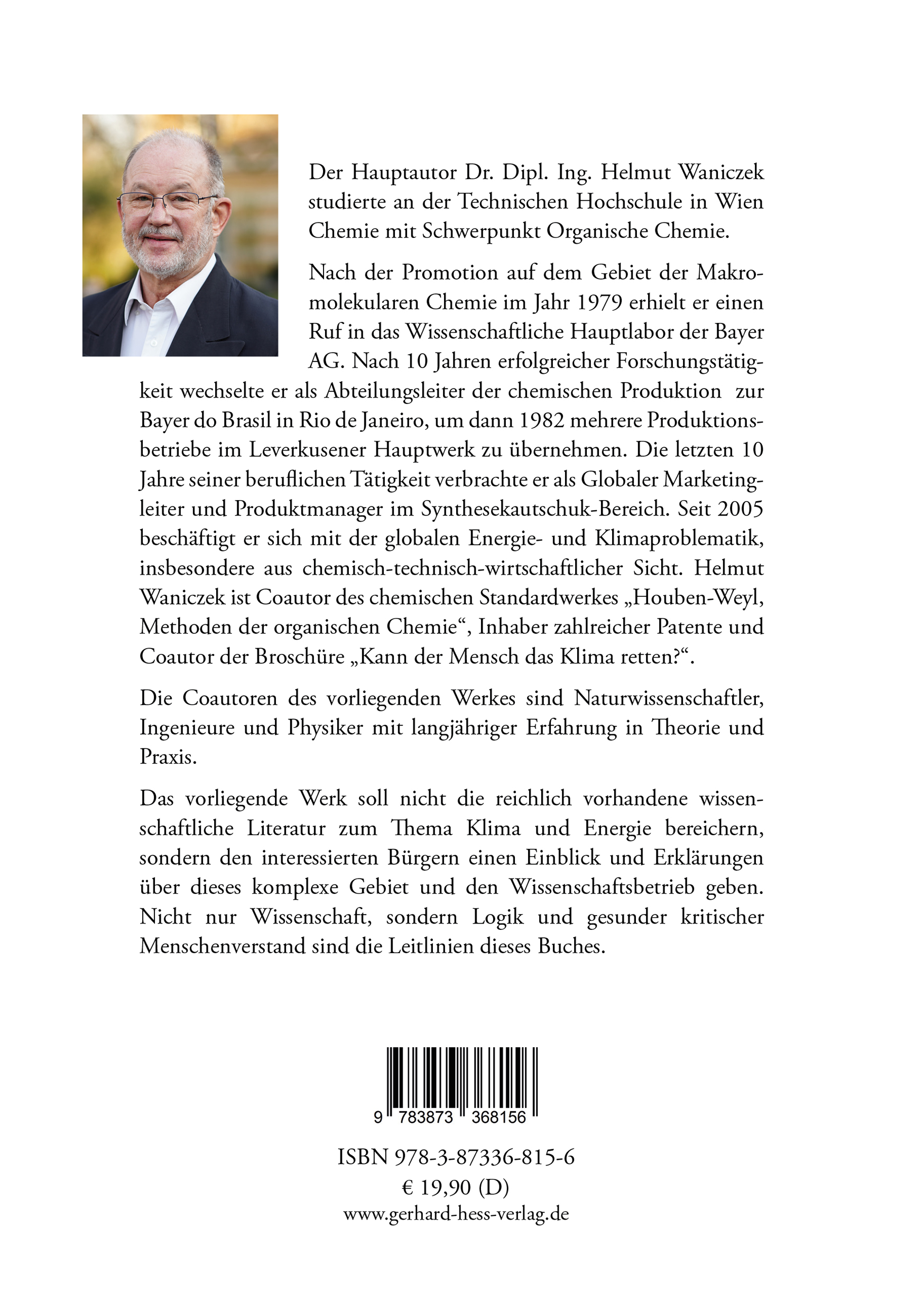 Das Buch soll interessierten Lesern einen Einblick in dieses komplexe Gebiet und den Wissenschaftsbetrieb geben. Nicht nur Wissenschaft, sondern Logik und gesunder kritischer Menschenverstand sind die Leitlinien dieses Buches. Der Autor, promovierter Chemiker, war viele Jahre als Forscher und Manager in der chemischen Industrie tätig. Der Hauptautor Dr. Dipl. Ing. Helmut Waniczek studierte an der Technischen Hochschule in Wien Chemie mit Schwerpunkt Organische Chemie. Nach der Promotion auf dem Gebiet der Makromolekularen Chemie im Jahr 1979 erhielt er einen Ruf in das Wissenschaftliche Hauptlabor der Bayer AG. Nach 10 Jahren erfolgreicher Forschungstätigkeit wechselte er als Abteilungsleiter der chemischen Produktion zur Bayer do Brasil in Rio de Janeiro, um dann 1982 mehrere Produktionsbetriebe im Leverkusener Hauptwerk zu übernehmen. Die letzten 10 Jahre seiner beruflichen Tätigkeit verbrachte er als Globaler Marketingleiter und Produktmanager im Synthesekautschuk-Bereich. Seit 2005 beschäftigt er sich mit der globalen Energie- und Klimaproblematik, insbesondere aus chemisch-technisch-wirtschaftlicher Sicht. Helmut Waniczek ist Coautor des chemischen Standardwerkes "Houben-Weyl, Methoden der organischen Chemie", Inhaber zahlreicher Patente und Coautor der Broschüre "Kann der Mensch das Klima retten?". Die Coautoren des vorliegenden Werkes sind Naturwissenschaftler, Ingenieure und Physiker mit langjähriger Erfahrung in Theorie und Praxis.