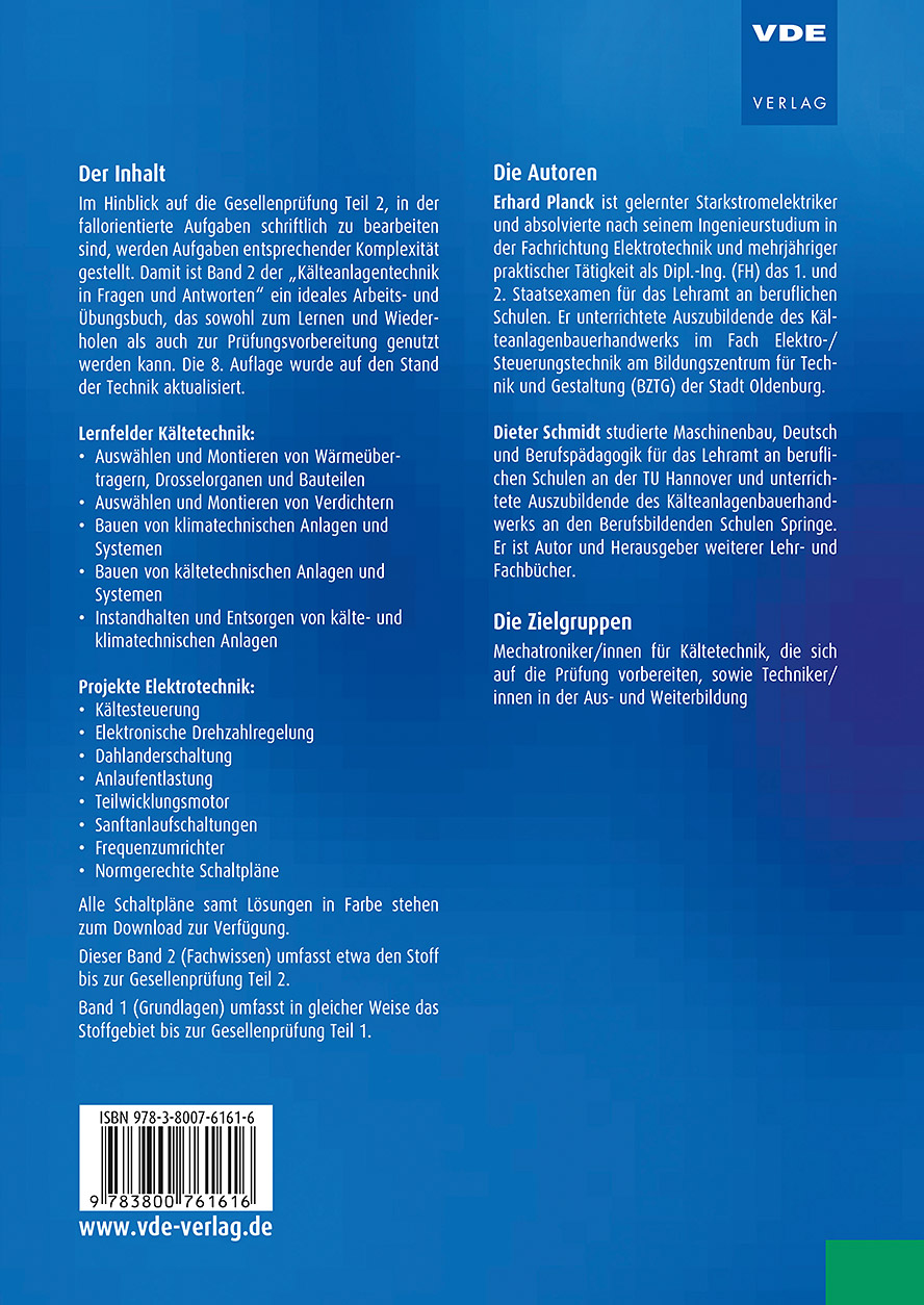 Erhard Planck unterrichtete Auszubildende des Kälteanlagenbauerhandwerks im Fach Elektro-/ Steuerungstechnik am Bildungszentrum für Technik und Gestaltung (BZTG) der Stadt Oldenburg. Dieter Schmidt unterrichtete Auszubildende des Kälteanlagenbauerhandwerks an den Berufsbildenden Schulen Springe. Er ist Mitglied im Gesellenprüfungsausschuss der Kälteanlagenbauer-Innung Niedersachsen/Sachsen-Anhalt sowie Autor und Herausgeber weiterer Lehr- und Fachbücher.
