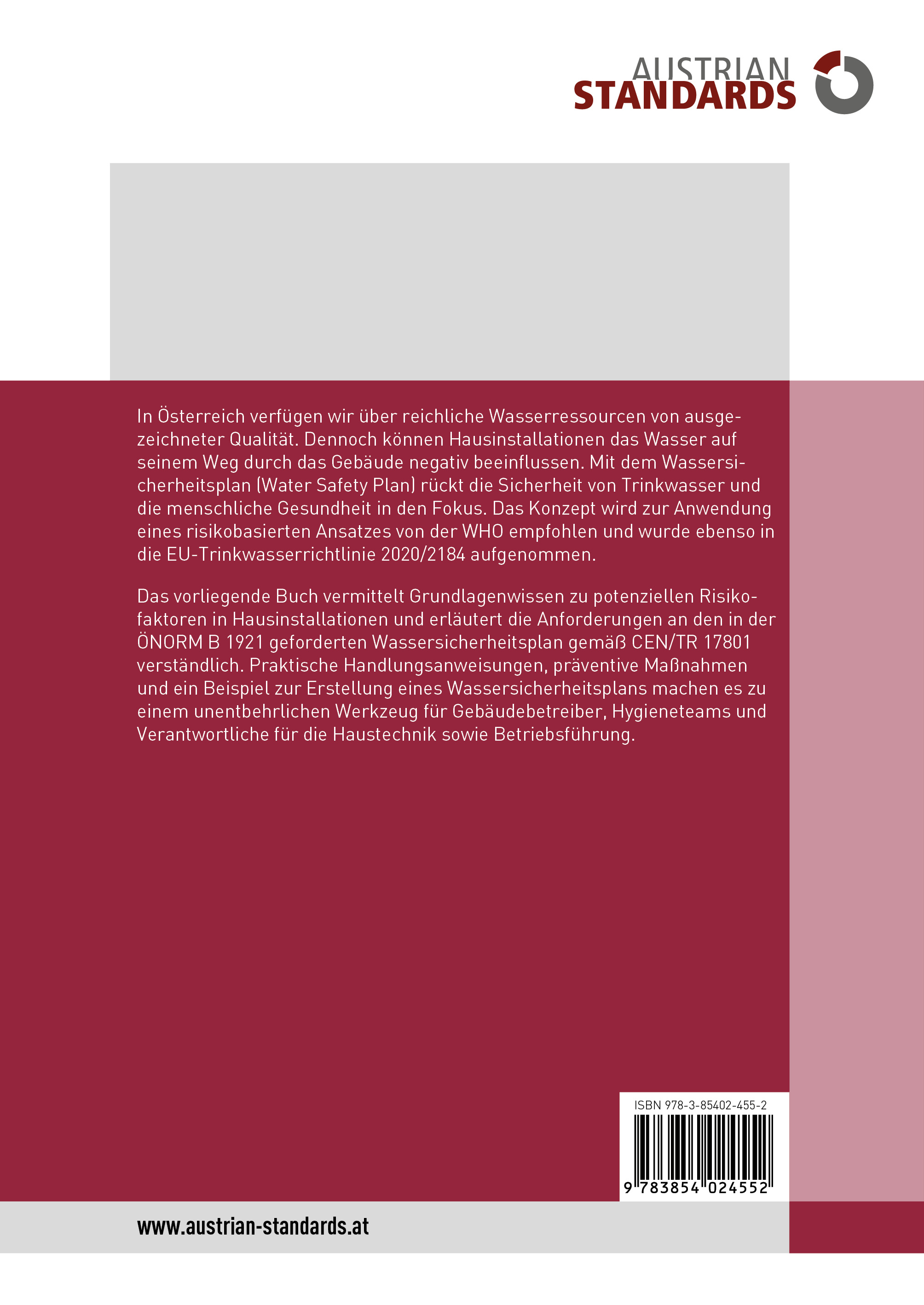 Das vorliegende Buch vermittelt Grundlagenwissen zu potenziellen Risikofaktoren in Hausinstallationen und erläutert die Anforderungen an den in der ÖNORM B 1921 geforderten Wassersicherheitsplan gemäß CEN/TR 17801 verständlich. Praktische Handlungsanweisungen, präventive Maßnahmen und ein Beispiel zur Erstellung eines Wassersicherheitsplans machen es zu einem unentbehrlichen Werkzeug für Gebäudebetreiber, Hygieneteams und Verantwortliche für die Haustechnik sowie Betriebsführung.