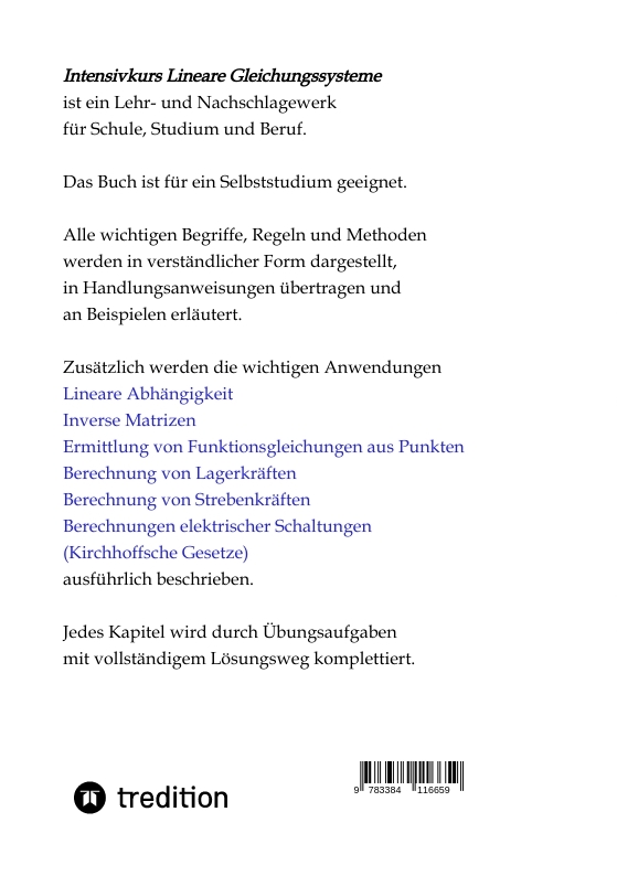 Intensivkurs Lineare Gleichungssystemeist ein Lehr- und Nachschlagewerkfür Schule, Studium und Beruf.Das Buch ist für ein Selbststudium geeignet.Alle wichtigen Begriffe, Regeln und Methodenwerden in verständlicher Form dargestellt,in Handlungsanweisungen übertragen undan Beispielen erläutert.Zusätzlich werden die wichtigen AnwendungenLineare AbhängigkeitInverse MatrizenErmittlung von Funktionsgleichungen aus PunktenBerechnung von LagerkräftenBerechnung von StrebenkräftenBerechnungen elektrischer Schaltungen(Kirchhoffsche Gesetze)ausführlich beschrieben.Jedes Kapitel wird durch Übungsaufgabenmit vollständigem Lösungsweg komplettiert.