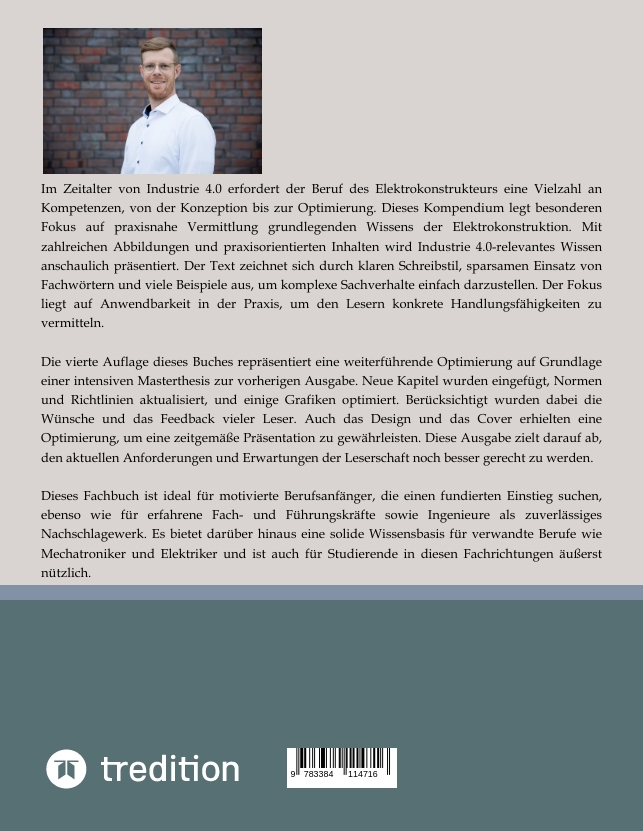 "Einfach ist schwieriger als kompliziert. Du musst hart arbeiten, um dein Denken zu vereinfachen. Aber es ist die Mühe wert, denn wenn du es geschafft hast, dann kannst du Berge versetzen."-Steve Jobs-Von der Konzeption über Projektierung bis hin zu Standardisierung und Optimierungsmaßnahmen: Im Zeitalter von Industrie 4.0 erfordert der Beruf des Elektrokonstrukteurs eine Vielzahl an Kompetenzen. Um am Puls der Zeit zu bleiben und nicht von der Entwicklung abgehängt zu werden, muss sich der Wandel der Arbeitswelt in der Aus- und Weiterbildung niederschlagen. Nur wer sich mit dem Wandel bewegt, kann die Zukunft mitgestalten. Dieses Kompendium legt besonderen Fokus auf die praxisnahe Vermittlung grundlegenden Wissens der Elektrokonstruktion, und es dient als praktisches Nachschlagewerk. Durch zahlreiche Abbildungen sowie In-halte, die wertvolle Ideen für die Optimierung und den Ausbau des Engineering-Prozesses bieten, wird Industrie 4.0-relevantes Wissen sachkundig und anschaulich präsentiert. Der Text zeichnet sich durch einen sparsamen Einsatz von Fachwörtern, einen klaren Schreibstil und zahlreiche Beispiele aus, um komplexe Sachverhalte einfach darzustellen. Der Fokus liegt dabei bewusst auf der Anwendbarkeit in der Praxis, um den Lesern konkrete Handlungsfähigkeiten zu vermitteln.Die vierte Auflage dieses Buches repräsentiert eine weiterführende Optimierung auf Grundlage einer intensiven Masterthesis zur vorherigen Ausgabe. Neue Kapitel wurden eingefügt, Normen und Richtlinien aktualisiert, und einige Grafiken optimiert. Berücksichtigt wurden dabei die Wünsche und das Feedback vieler Leser. Auch das Design und das Cover erhielten eine Optimierung, um eine zeitgemäße Präsentation zu gewährleisten. Diese Ausgabe zielt darauf ab, den aktuellen Anforderungen und Erwartungen der Leserschaft noch besser gerecht zu werden.
