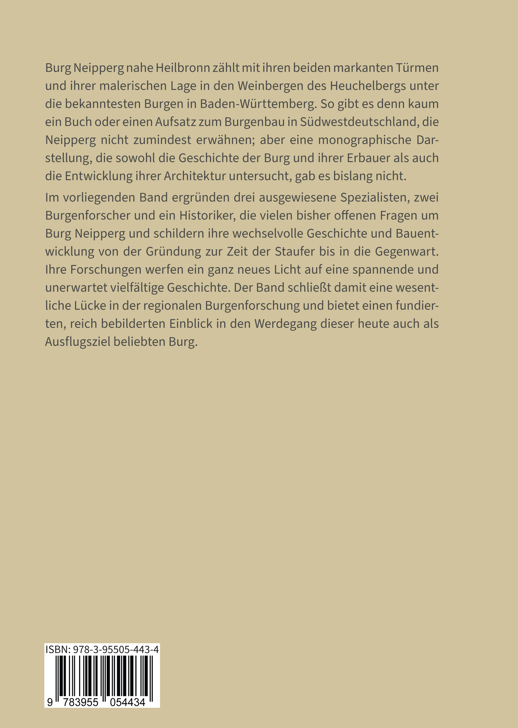 Burg Neipperg nahe Heilbronn zählt mit ihren beiden markanten Türmen und ihrer malerischen Lage in den Weinbergen des Heuchelbergs unter die bekanntesten Burgen in Baden-Württemberg. So gibt es denn kaum ein Buch oder einen Aufsatz zum Burgenbau in Südwestdeutschland, die Neipperg nicht zumindest erwähnen; aber eine monographische Darstellung, die sowohl die Geschichte der Burg und ihrer Erbauer als auch die Entwicklung ihrer Architektur untersucht, gab es bislang nicht. Im vorliegenden Band ergründen drei ausgewiesene Spezialisten, zwei Burgenforscher und ein Historiker, die vielen bisher offenen Fragen um Burg Neipperg und schildern ihre wechselvolle Geschichte und Bauentwicklung von der Gründung zur Zeit der Staufer bis in die Gegenwart. Ihre Forschungen werfen ein ganz neues Licht auf eine spannende und unerwartet vielfältige Geschichte. Der Band schließt damit eine wesentliche Lücke in der regionalen Burgenforschung und bietet einen fundierten, reich bebilderten Einblick in den Werdegang dieser heute auch alsAusflugsziel beliebten Burg.