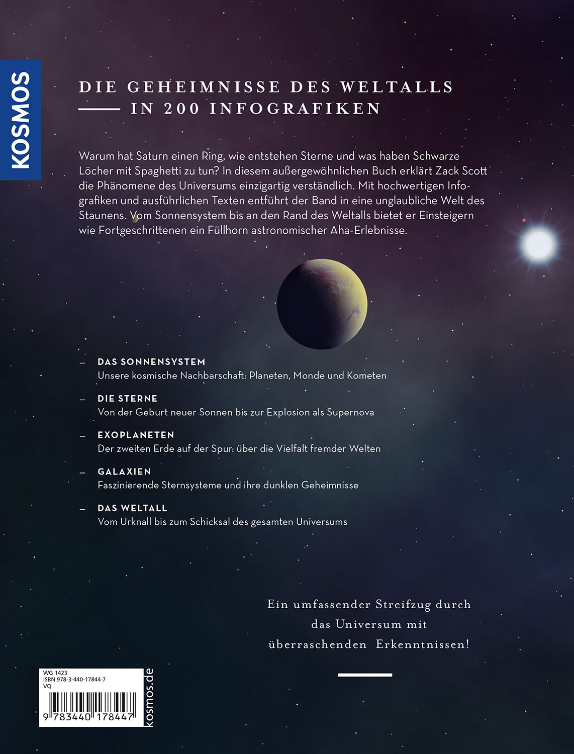 Ein ganz besonderes Werk: Zack Scott bietet uns mit diesem außergewöhnlichen Geschenkbuch einen Streifzug durch das gesamte Universum - von unserer kosmischen Heimat, dem Sonnensystem, bis hin zu weit entfernten Galaxien und dem Ende des Weltalls. Mit künstlerisch hochwertigen Infografiken und ausführlichen Detailtexten entführt der Band in eine unglaubliche Welt des Staunens und bietet Einsteigern wie Fortgeschrittenen ein Füllhorn astronomischen Wissens. So wird Astronomie verständlich und das weite Universum förmlich begreifbar.
