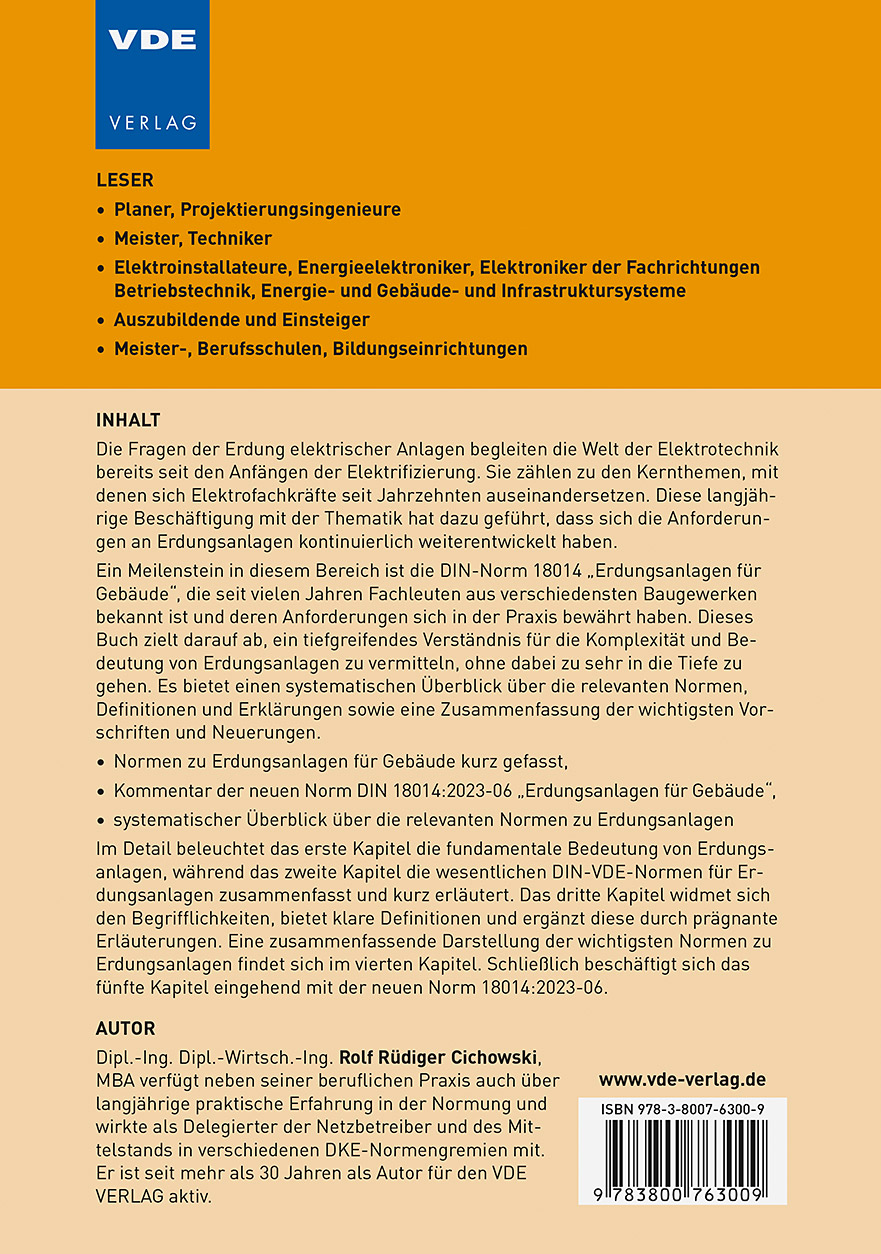 Dipl.-Ing. Dipl.-Wirtsch.-Ing. Rolf Rüdiger Cichowski, MBA verfügt neben seiner beruflichen Praxis auch über langjährige praktische Erfahrung in der Normung und wirkte als Delegierter der Netzbetreiber und des Mittelstands in verschiedenen DKE-Normengremien mit. Er ist seit mehr als 30 Jahren als Autor für den VDE VERLAG aktiv.