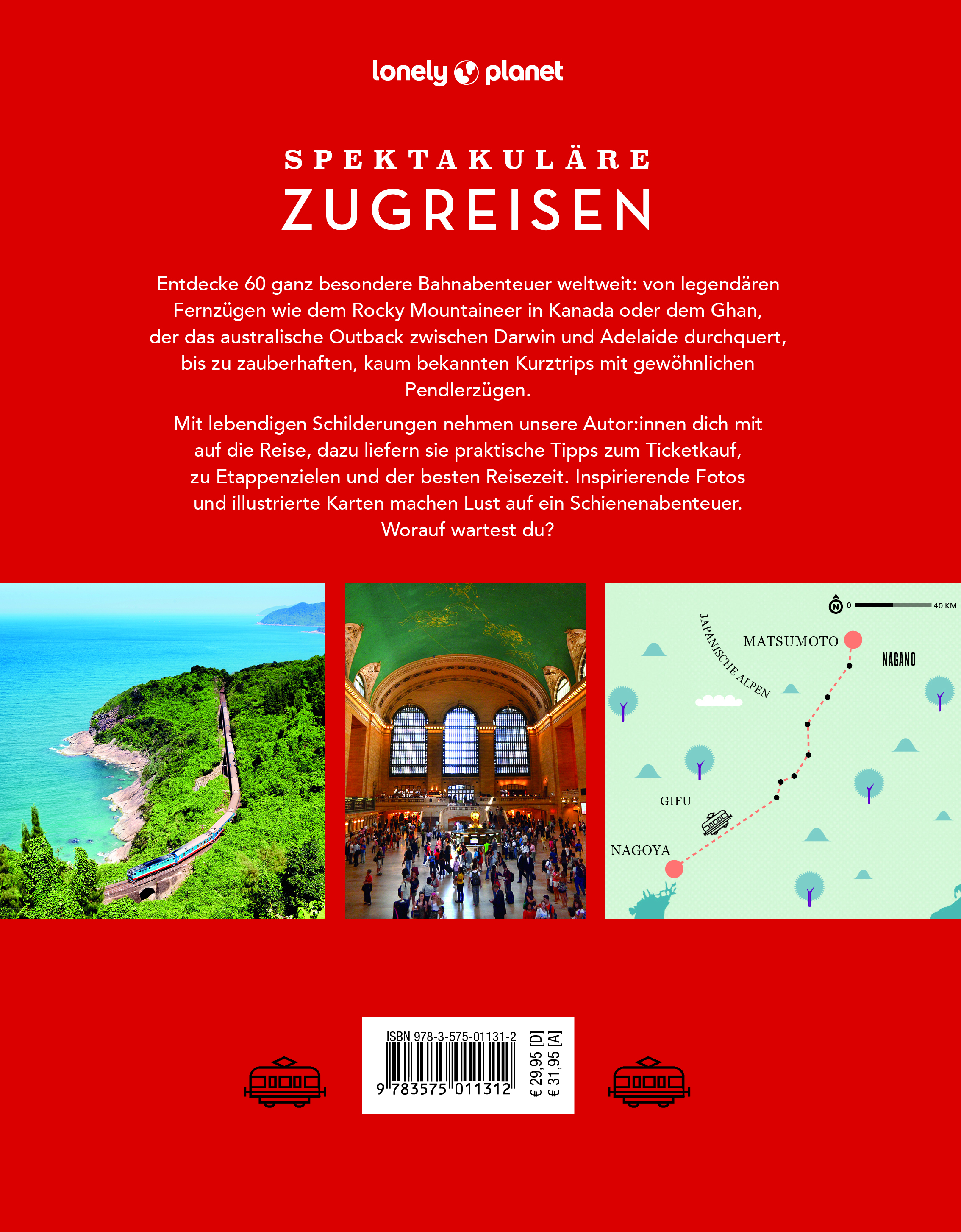 DIESE KOMPLETT ÜBERARBEITETE NEUAUFLAGE des beliebten Lonely Planet Bildbandes "Legendäre Zugreisen_ nimmt dich mit auf eine Reise um die Welt. In berühmten Zügen wie dem Orient- oder dem Glacier-Express und mit Exoten auf den weniger bekannten, dafür umso abenteuerlicheren Routen: entlang der Pazifikküste der USA im Coast Starlight oder durch die Anden auf der einzigen Bahnlinie zwischen Lima und Huancavelica. "Spektakuläre Zugreisen_ steckt voller Entdeckungen für Kenner und Neulinge unter den Bahnfans und liefert in bester Lonely-Planet-Manier Geschichten, Fakten und Tipps aus der großen Community der Reiseautor:innen.