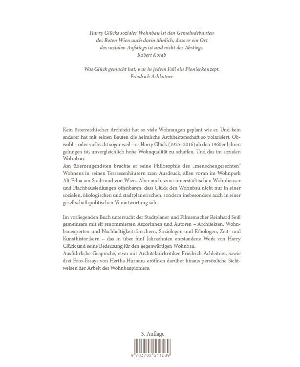 Rechtzeitig zu Harry Glücks 100. Geburtstag im Februar 2025 legt der Verlag Anton Pustet das Standardwerk des Stadtplaners Reinhard Seiß zum uvre des Wohnbaupioniers neu auf. Zahlreiche Autor*innen aus Architektur, Wohnbau, Soziologie, Ethologie und Kunstgeschichtegehen dabei nicht zuletzt der Frage nach,worin die Bedeutung Glücksfür den heutigen Wohnbau liegt.