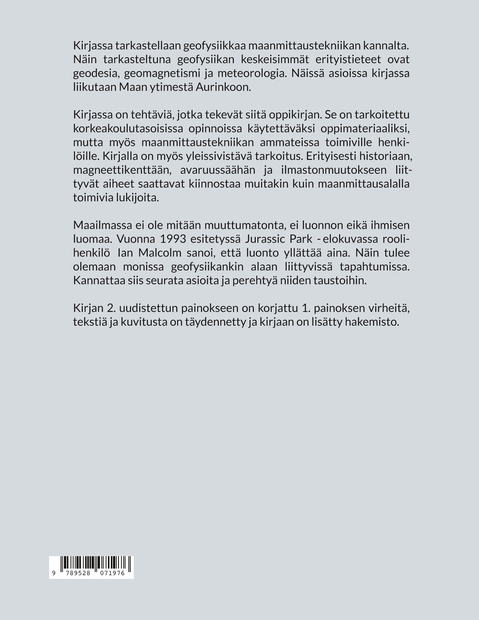 Geofysiikka - Kiinteä Maa, geomagnetismi ja ilmasto tarkastelee geofysiikkaa maanmittaustekniikan näkökulmasta. Yleisesti geofysiikka tutkii Maan kiinteän osan, vesikehän, ilmakehän sekä magneettikentän ja -kehän fysikaalisia ominaisuuksia ja ilmiöitä. Maanmittaustekniikan näkökulmasta geofysiikan keskeisimmät erityistieteet ovat geodesia, geomagnetismi ja meteorologia. Näissä tutkimusaiheissa kirjassa liikutaan Maan ytimestä Aurinkoon.