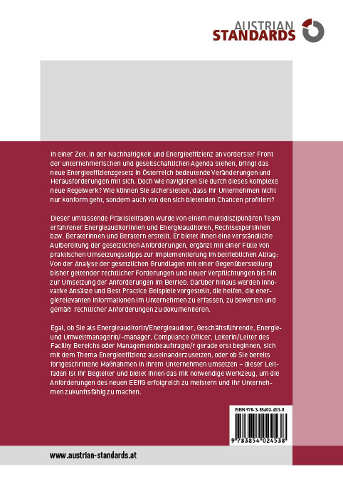 Dieser umfassende Praxisleitfaden wurde von einem multidisziplinären Team erfahrener Energieauditorinnen und Energieauditoren, Rechtsexpertinnen bzw. Beraterinnen und Beratern erstellt. Er bietet Ihnen eine verständliche Aufbereitung der gesetzlichen Anforderungen, ergänzt mit einer Fülle von praktischen Umsetzungsstipps zur Implementierung im betrieblichen Alltag: Von der Analyse der gesetzlichen Grundlagen mit einer Gegenüberstellung bisher geltender rechtlicher Forderungen und neuer Verpflichtungen bis hin zur Umsetzung der Anforderungen im Betrieb. Darüber hinaus werden innovative Ansätze und Best Practice Beispiele vorgestellt, die helfen, die energierelevanten Informationen im Unternehmen zu erfassen, zu bewerten und gemäß rechtlicher Anforderungen zu dokumentieren.