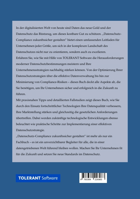 In der digitalisierten Welt von heute sind Daten das neue Gold und der Datenschutz das Rüstzeug, um dieses kostbare Gut zu schützen. "Datenschutz-Compliance zukunftssicher gestalten" bietet einen umfassenden Leitfaden für Unternehmen jeder Größe, um sich in der komplexen Landschaft des Datenschutzes nicht nur zu orientieren, sondern auch zu excelieren.Erfahren Sie, wie Sie mit Hilfe von TOLERANT Software die Herausforderungen moderner Datenschutzbestimmungen meistern und Ihre Unternehmensstrategien nachhaltig stärken können. Von der Optimierung Ihrer Datenschutzstrategien über die effektive Datenverwaltung bis hin zur Minimierung von Compliance-Risiken - dieses Buch deckt alle Aspekte ab, die Sie benötigen, um Ihr Unternehmen sicher und erfolgreich in die Zukunft zu führen.Mit praxisnahen Tipps und detaillierten Fallstudien zeigt dieses Buch, wie Sie durch den Einsatz fortschrittlicher Technologien Ihre Datenqualität verbessern, Ihre Marktstellung stärken und gleichzeitig die gesetzlichen Anforderungen übertreffen. Dabei werden zukünftige technologische Entwicklungen ebenso beleuchtet wie praktische Schritte zur Implementierung einer effektiven Datenschutzstrategie."Datenschutz-Compliance zukunftssicher gestalten" ist mehr als nur ein Fachbuch - es ist ein unverzichtbarer Begleiter für alle, die in einer datengetriebenen Welt führend bleiben wollen. Machen Sie Ihr Unternehmen fit für die Zukunft und setzen Sie neue Standards im Datenschutz.