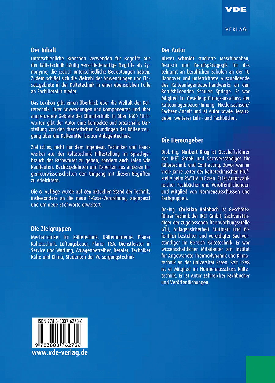 Dieter Schmidt studierte Maschinenbau, Deutsch und Berufspädagogik für das Lehramt an beruflichen Schulen an der TU Hannover und unterrichtete Auszubildende des Kälteanlagenbauerhandwerks an den Berufsbildenden Schulen Springe. Er war Mitglied im Gesellenprüfungsausschuss und ist Autor sowie Herausgeber weiterer Lehr- und Fachbücher. Die Herausgeber: Dipl.-Ing. Norbert Krug und Dr.-Ing. Christian Hainbach sind Geschäftsführer der IKET GmbH als Sachverständige tätig. Beide haben viele Jahre Berufserfahrung in der Kältetechnik in Praxis und Lehre, sind Autoren zahlreicher Fachbücher und Veröffentlichungen und Mitglieder in Normenausschüssen und Fachgruppen.