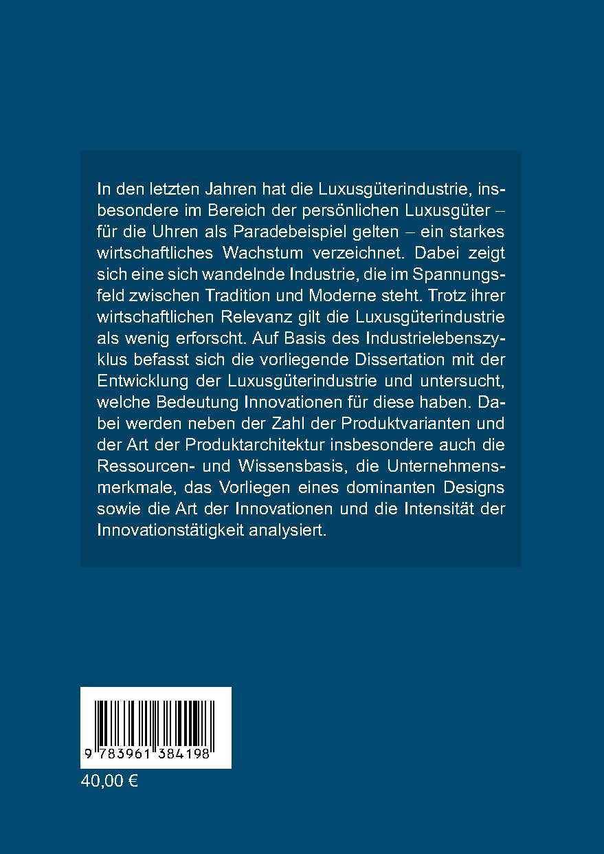 In den letzten Jahren hat die Luxusgüterindustrie, insbesondere im Bereich der persönlichen Luxusgüter – für die Uhren als Paradebeispiel gelten – ein starkes wirtschaftliches Wachstum verzeichnet. Dabei zeigt sich eine sich wandelnde Industrie, die im Spannungsfeld zwischen Tradition und Moderne steht. Trotz ihrer wirtschaftlichen Relevanz gilt die Luxusgüterindustrie als wenig erforscht. Auf Basis des Industrielebenszyklus befasst sich die vorliegende Dissertation mit der Entwicklung der Luxusgüterindustrie und untersucht, welche Bedeutung Innovationen für diese haben. Dabei werden neben der Zahl der Produktvarianten und der Art der Produktarchitektur insbesondere auch die Ressourcen- und Wissensbasis, die Unternehmensmerkmale, das Vorliegen eines dominanten Designs sowie die Art der Innovationen und die Intensität der Innovationstätigkeit analysiert.