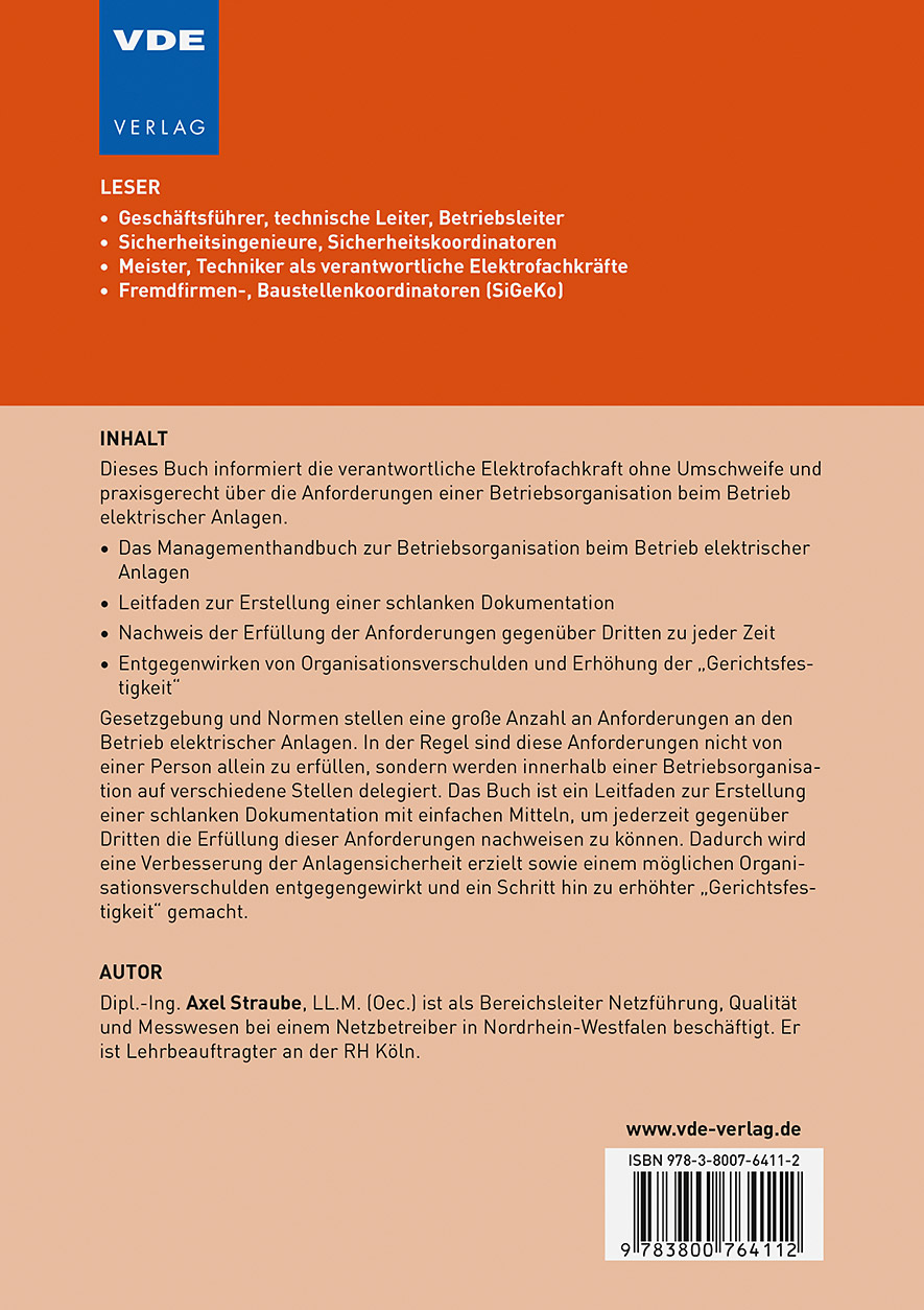 Dieses Buch informiert die verantwortliche Elektrofachkraft ohne Umschweife und praxisgerecht über die Anforderungen einer Betriebsorganisation beim Betrieb elektrischer Anlagen.- Das Managementhandbuch zur Betriebsorganisation beim Betrieb elektrischer Anlagen- Leitfaden zur Erstellung einer schlanken Dokumentation- Nachweis der Erfüllung der Anforderungen gegenüber Dritten zu jeder Zeit- Entgegenwirken von Organisationsverschulden und Erhöhung der "Gerichtsfestigkeit"Gesetzgebung und Normen stellen eine große Anzahl an Anforderungen an den Betrieb elektrischer Anlagen. In der Regel sind diese Anforderungen nicht von einer Person allein zu erfüllen, sondern werden innerhalb einer Betriebsorganisation auf verschiedene Stellen delegiert. Das Buch ist ein Leitfaden zur Erstellung einer schlanken Dokumentation mit einfachen Mitteln, um jederzeit gegenüber Dritten die Erfüllung dieser Anforderungen nachweisen zu können. Dadurch wird eine Verbesserung der Anlagensicherheit erzielt sowie einem möglichen Organisationsverschulden entgegengewirkt und ein Schritt hin zu erhöhter "Gerichtsfestigkeit" gemacht.