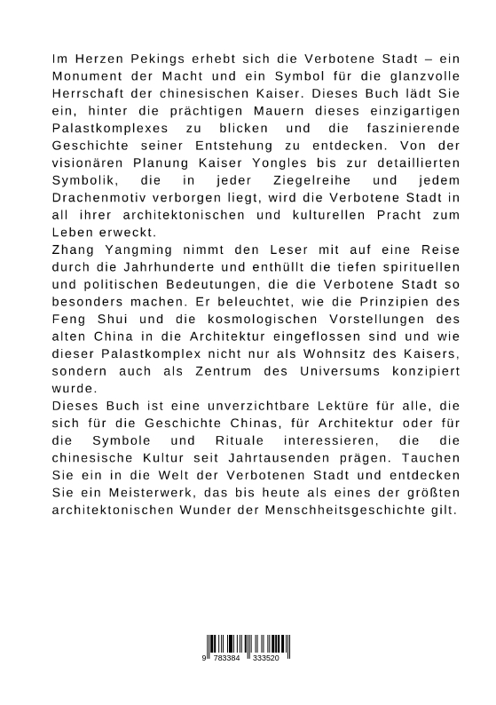 Im Herzen Pekings erhebt sich die Verbotene Stadt - ein Monument der Macht und ein Symbol für die glanzvolle Herrschaft der chinesischen Kaiser. Dieses Buch lädt Sie ein, hinter die prächtigen Mauern dieses einzigartigen Palastkomplexes zu blicken und die faszinierende Geschichte seiner Entstehung zu entdecken. Von der visionären Planung Kaiser Yongles bis zur detaillierten Symbolik, die in jeder Ziegelreihe und jedem Drachenmotiv verborgen liegt, wird die Verbotene Stadt in all ihrer architektonischen und kulturellen Pracht zum Leben erweckt.Zhang Yangming nimmt den Leser mit auf eine Reise durch die Jahrhunderte und enthüllt die tiefen spirituellen und politischen Bedeutungen, die die Verbotene Stadt so besonders machen. Er beleuchtet, wie die Prinzipien des Feng Shui und die kosmologischen Vorstellungen des alten China in die Architektur eingeflossen sind und wie dieser Palastkomplex nicht nur als Wohnsitz des Kaisers, sondern auch als Zentrum des Universums konzipiert wurde.Dieses Buch ist eine unverzichtbare Lektüre für alle, die sich für die Geschichte Chinas, für Architektur oder für die Symbole und Rituale interessieren, die die chinesische Kultur seit Jahrtausenden prägen. Tauchen Sie ein in die Welt der Verbotenen Stadt und entdecken Sie ein Meisterwerk, das bis heute als eines der größten architektonischen Wunder der Menschheitsgeschichte gilt.